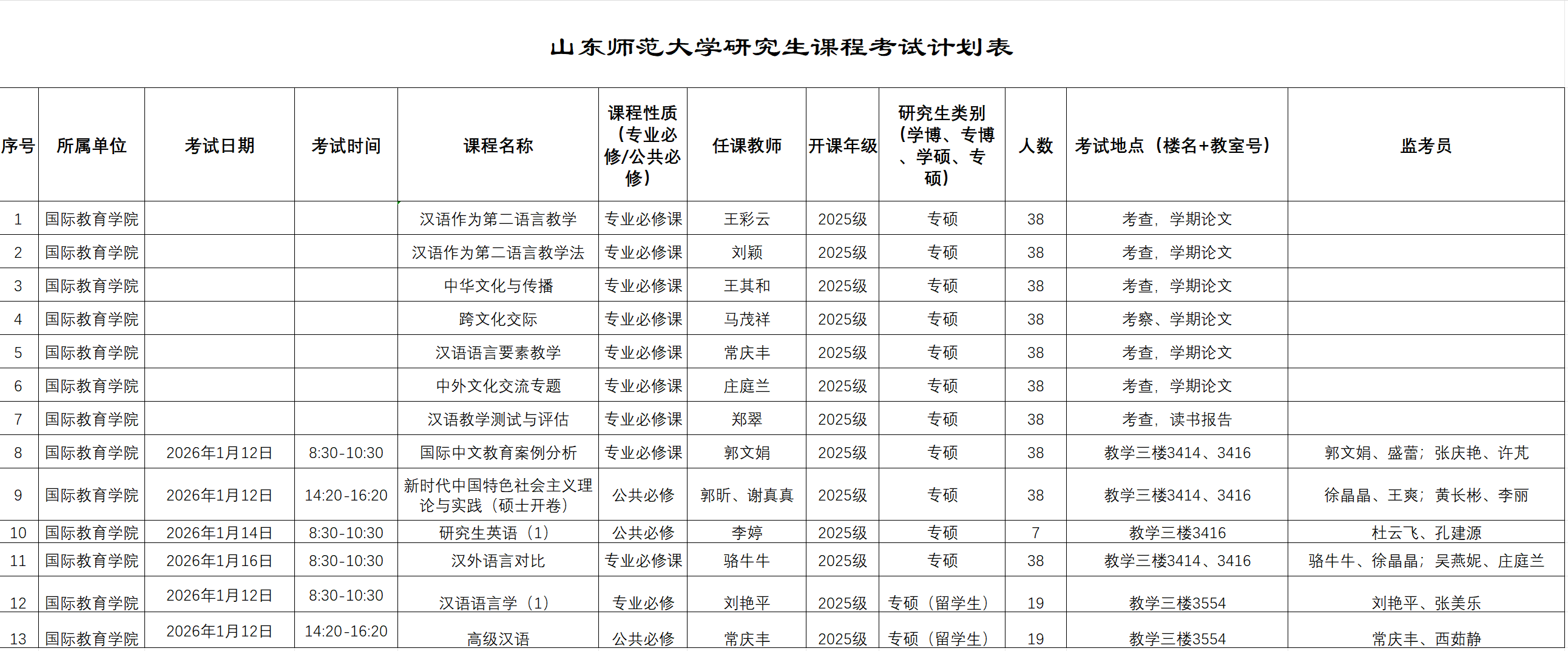 2025-2026学年第一学期2025级国际中文教育专业硕士研究生期末考试安排表