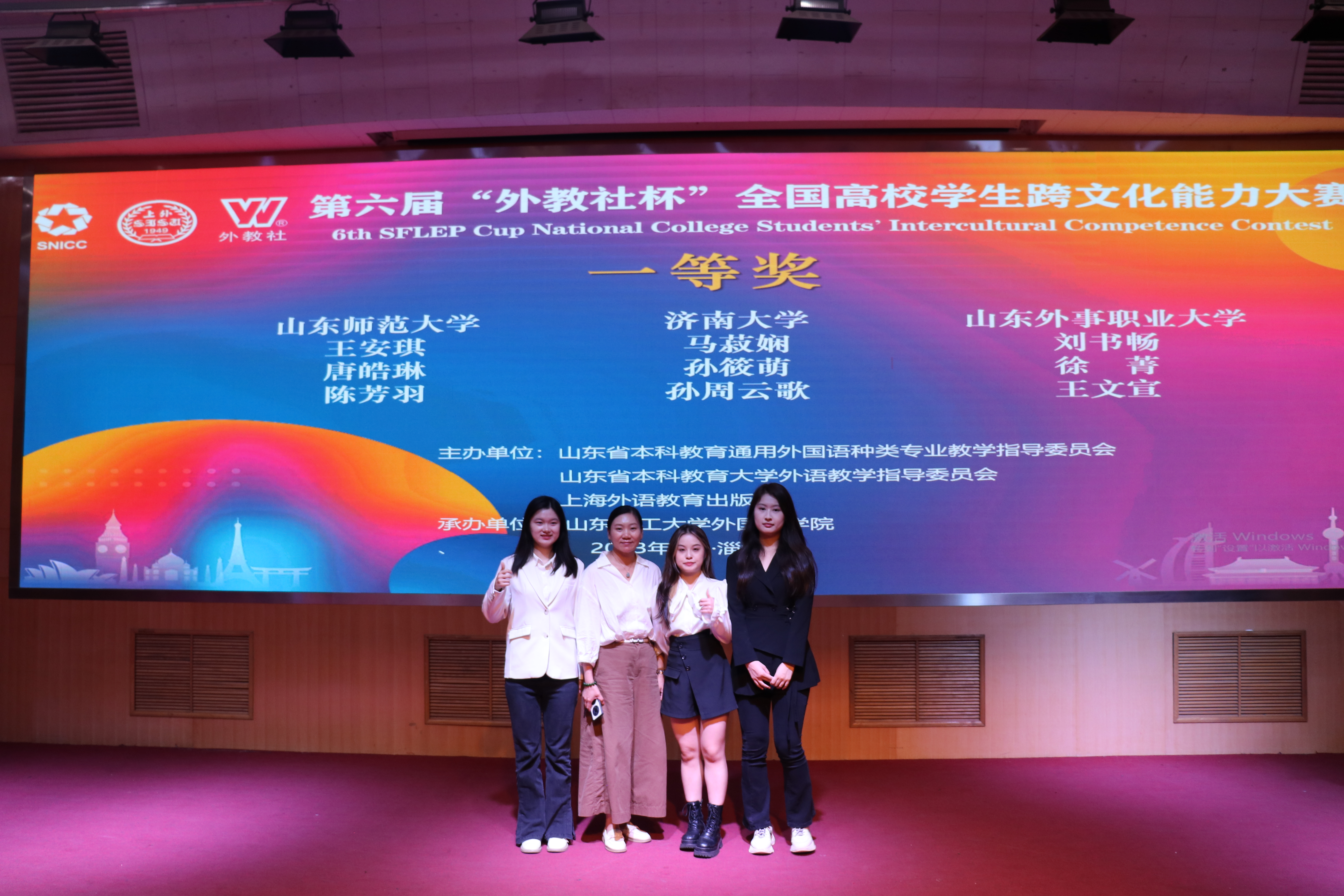9月24日,由上海外国语大学主办,中国教育国际交流协会指导,上海外国语大学跨文化研究中心提供学术支持,山东理工大学承办的2023“外教社”全国高校学生跨文化能力大赛(山东赛区),经过两天的激烈角逐在山东理工大学圆满落幕。由我院李群老师、外国语学院王珑珑、李繁老师共同指导的21级国际教育学院的陈芳羽同学、外国语学院王安琪同学、新闻与传媒学院唐皓琳同学经过一周时间的紧张备赛代表我校参赛,最后荣获山东赛区决赛一等奖和最佳团队奖的优异成绩,李群老师荣获优秀指导教师称号。