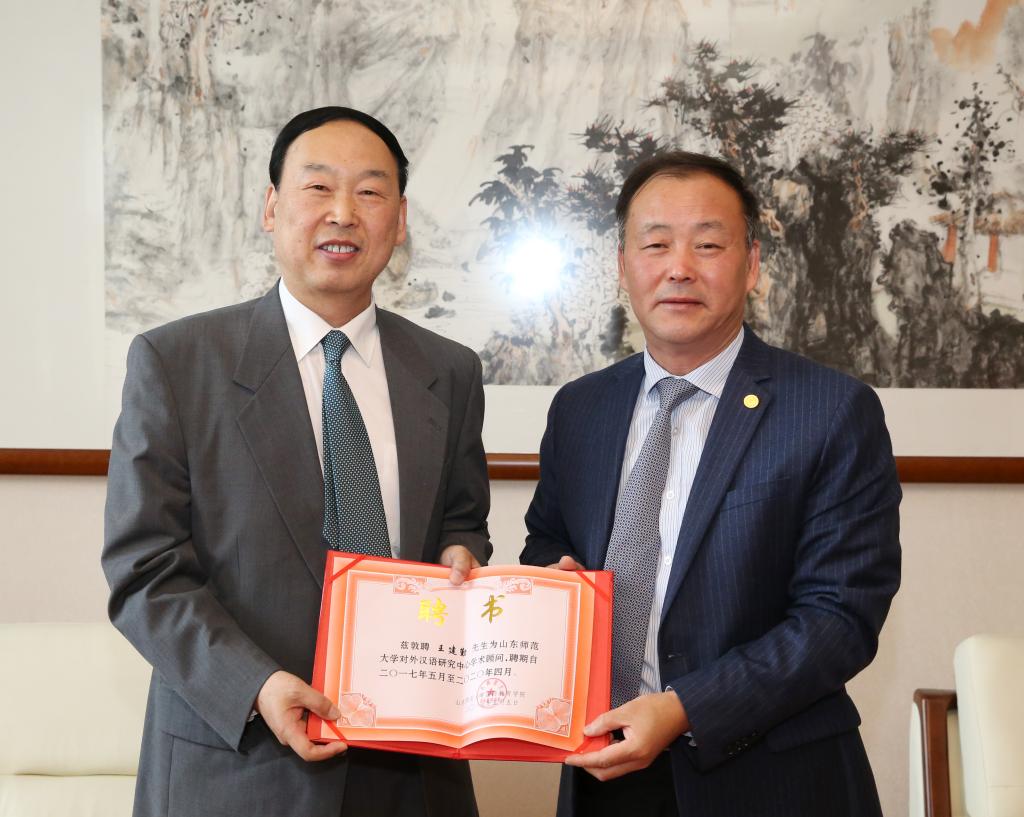 5月4日上午,学校在千佛山校区文化楼二层接待室举行仪式,聘任北京语言大学对外汉语研究中心主任王建勤为兼职教授,并为山东师范大学对外汉语研究中心揭牌。副校长张文新出席聘任和揭牌仪式,校办、人事处、研究生院、社科处、教务处、宣传部、国际教育学院等部门和单位负责同志参加仪式。仪式由国际教育学院周连勇院长主持。