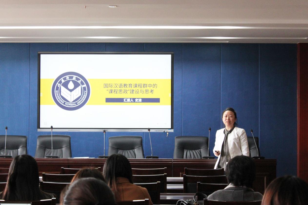 随后,史洁分享了自己从主讲课程专业角度出发对课程思政建设的几点思考。史洁教授从课程思政的缘起入手,介绍了其对“如何把课程思政放入到内容当中去”的宝贵经验。史教授认为,课程思政建设首先需要打造课程体系。以课堂为主渠道,把思想政治教育与专业知识教育有机结合起来,深悟认知课程思政。在此基础上,史洁教授提出了打造多维度下的课程群,即以全员育人体系做支撑,打造以外语教育心理学、职业教育概论、课堂观察与实践等内容为同心圆的国际汉语教育课程群,将社会主义核心价值观贯穿整个教学过程,将课程思政元素更好的融入课堂教学,通过知识传授,讲解中华优秀传统文化、特色社会主义先进文化;通过课程思政进行爱党爱国爱民、实事求是、勇于探索的价值观塑造。
