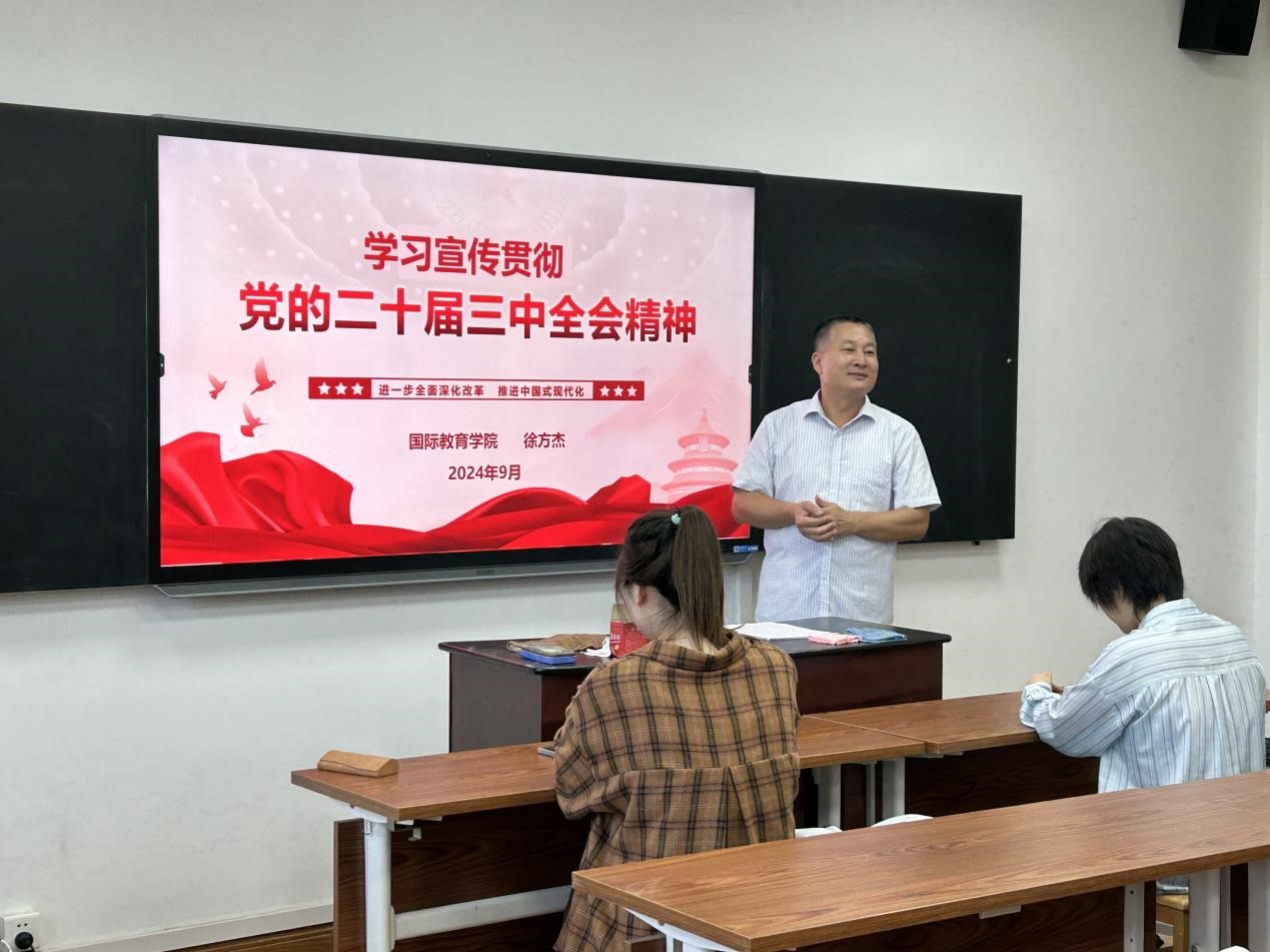 9月6日下午,国际教育学院研究生在3649教室举办学习党的二十届三中全会精神宣讲会,宣讲会由学院党委副书记、纪委书记徐方杰主讲,2022级全体研究生参加会议。
