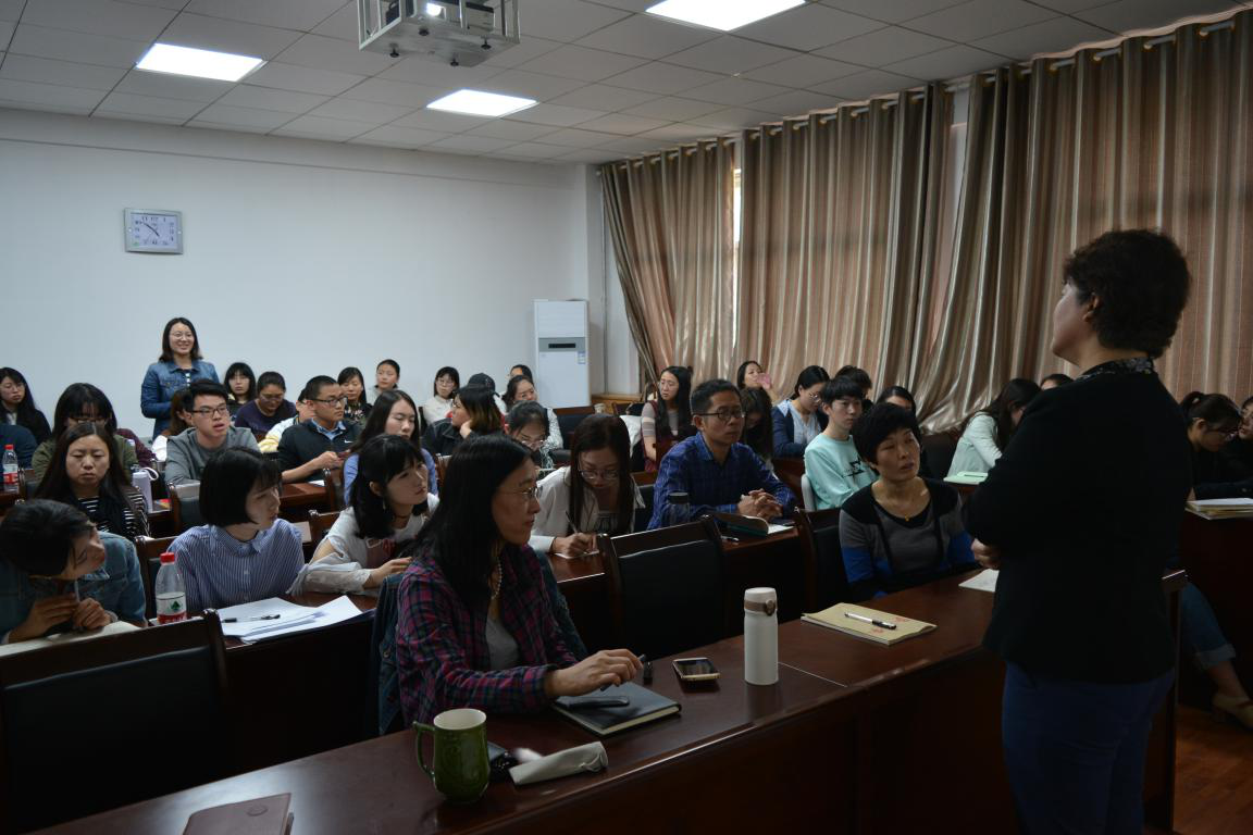 最后,姜教授就对外汉语教师在汉语教学中的作用进行了动情地讲解。从“三教”的问题出发,结合所见所闻,跟在座的师生分享了教学实践和随堂观察中遇到的现象,结合现象进一步诠释教师在教学中的重要作用。姜教授认为教师的教学应遵循“最近发展区”的原则,首先给学生分配难度稍高于原有语言水平的任务,调动其他们的积极性,待学生水平最近发展区水平以后再进入下一个最近发展区的学习,再调动学生学习积极性的前提下发掘学生的潜能,从而实现语言水平的持续提高。同时,要学会利用有限的教学环境营造好的氛围,为汉语学习者,特别是海外低龄汉语学习者,提供一个接近于目的语环境又贴近学生文化和特点的学习环境。此外,她还提出了“寓教于乐”的观点,以活泼生动的案例向在座的师生展示了如何利用既有条件实现沉浸式教学模式。最后,姜教授鼓励新手教师要秉持工匠精神,仔细备课,反复琢磨,不能急于求成,呀在不断地积累和实践中改进教学的策略和方法。报告始终贯彻理论联系实际的原则,将艰深的理论寓于活泼的案例和幽默风趣的语言中,并收到了良好的效果。