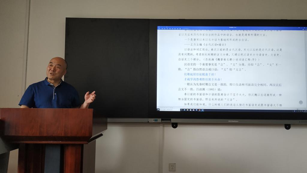 讲座伊始,雷汉卿教授以古代汉语书面语的两个系统为切入点,通过举例的方式解释了文言和白话的区别,进而指出汉语史的一个重要事实——“言”“文”分离,即“言”“文”不一致,其中“言”指自然语言或口语,“文”指文言。雷教授强调,从语言研究的角度而言,古代一切用汉语写下来的文字记载都有重要的研究价值,但文言一直占据领先地位,白话长期受到轻视,而白话更能反映汉语真实的面貌,目前来说更有研究价值。