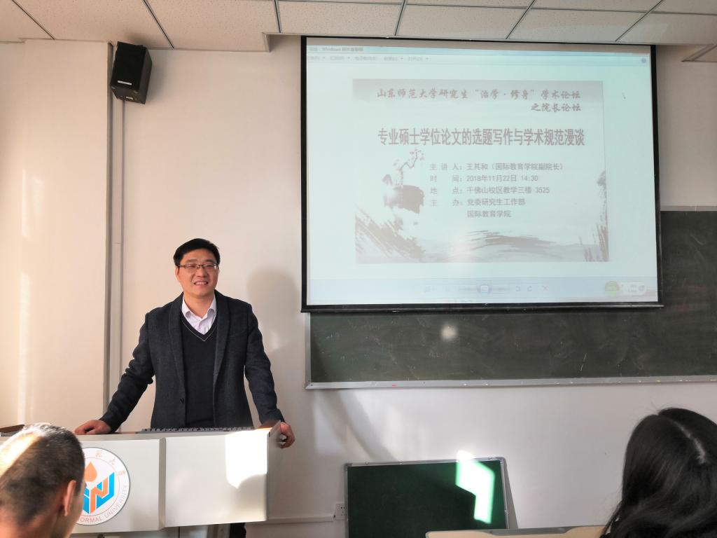 11月22日,由党委研究生工作部主办,国际教育学院承办的研究生“治学·修身”学术论坛在千佛山校区教学三楼3525教室举办。国际教育学院副院长王其和教授作了题为“专业硕士学位论文的选题与学术规范漫谈”的学术报告。国际教育学院全体研究生、部分其他学院相关专业研究生参加了此次报告会。