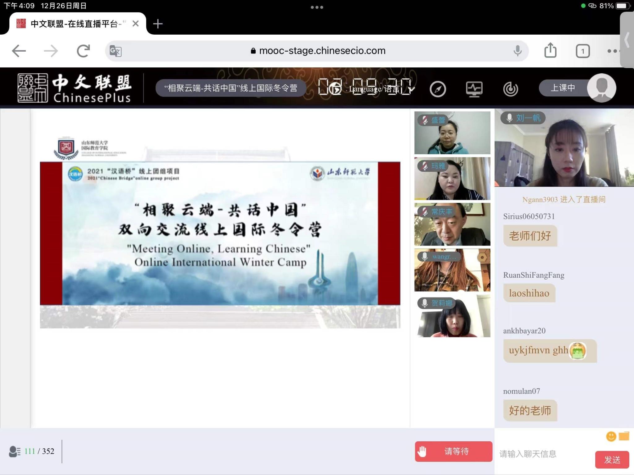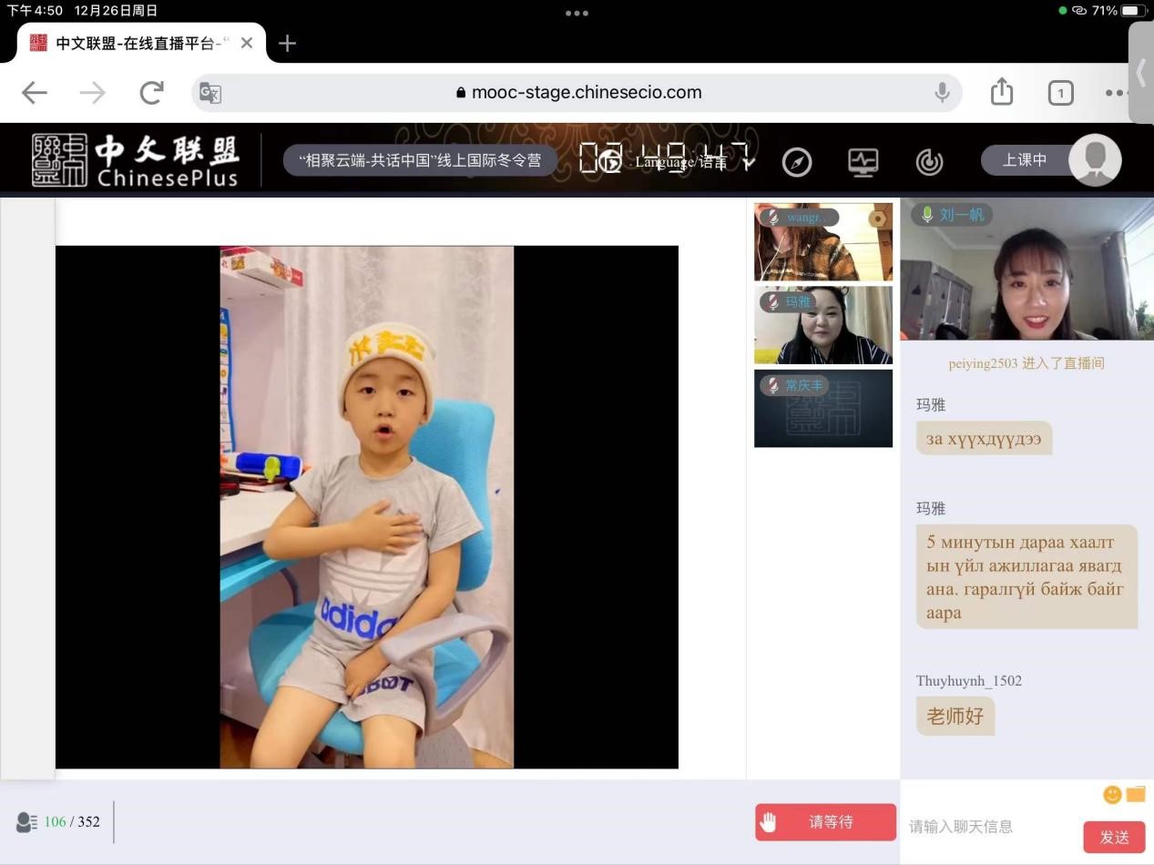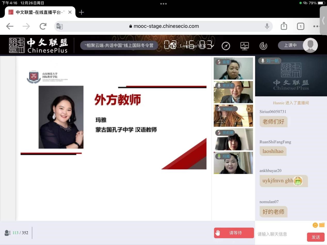 2021年12月26日,山东师范大学2020汉语桥“相聚云端 共话中国”双向交流线上国际冬令营结业仪式于中文联盟线上平台成功举办。