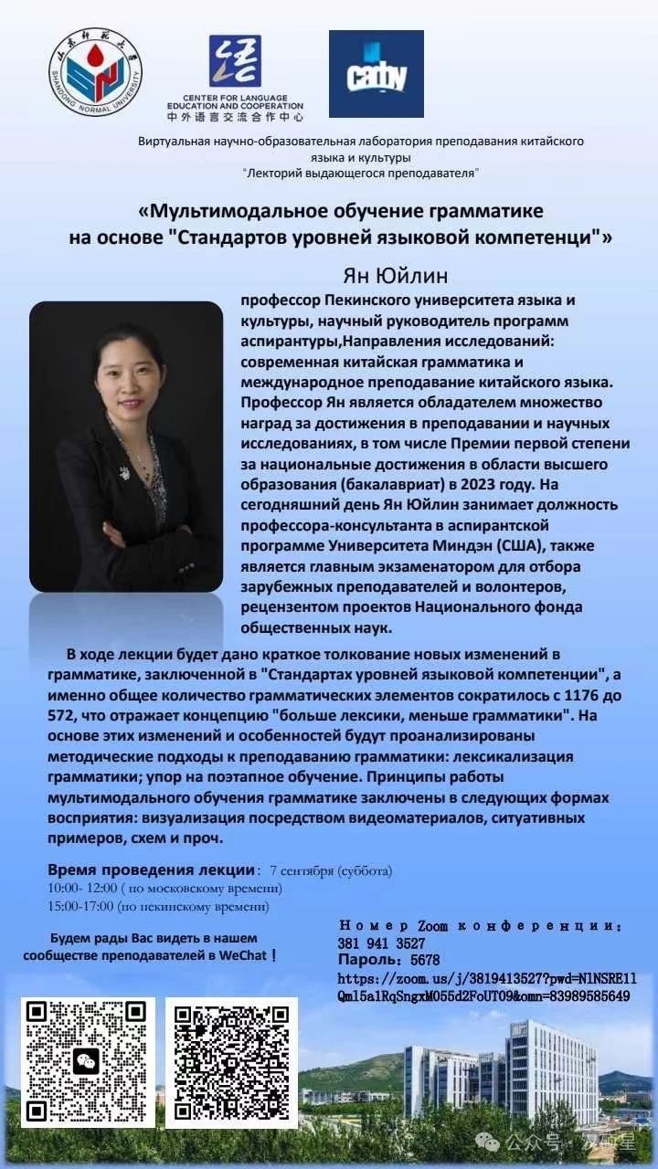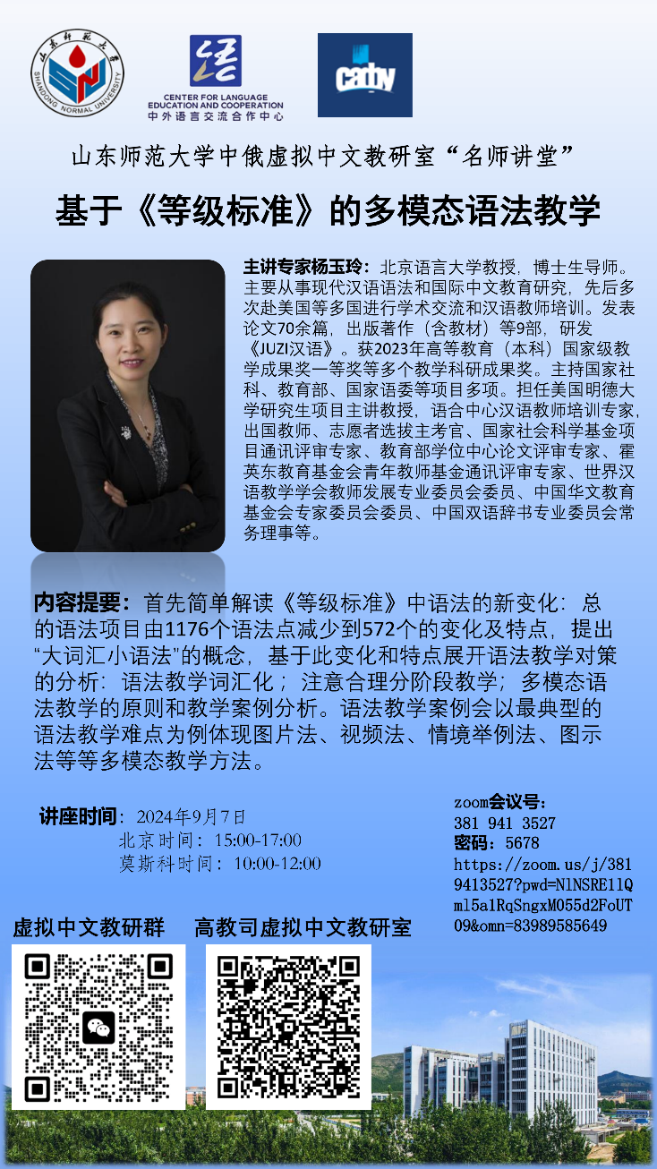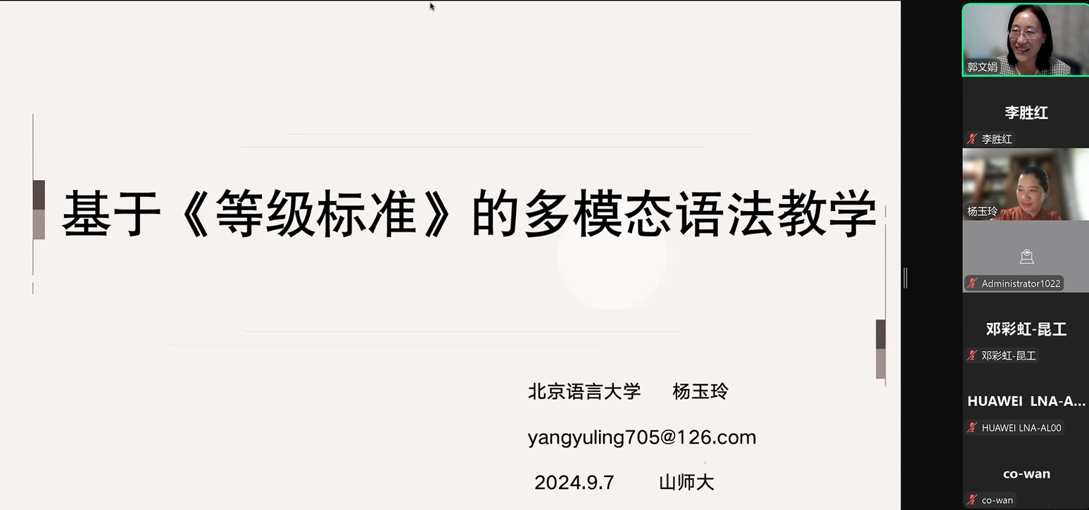 9月8日,北京语言大学杨玉玲教授应邀作《基于<等级标准>的多模态语法教学》的学术讲座,160多位国内国外中文教师参加了活动。讲座由虚拟中文教研室负责人、国际教育学院郭文娟副教授主持。