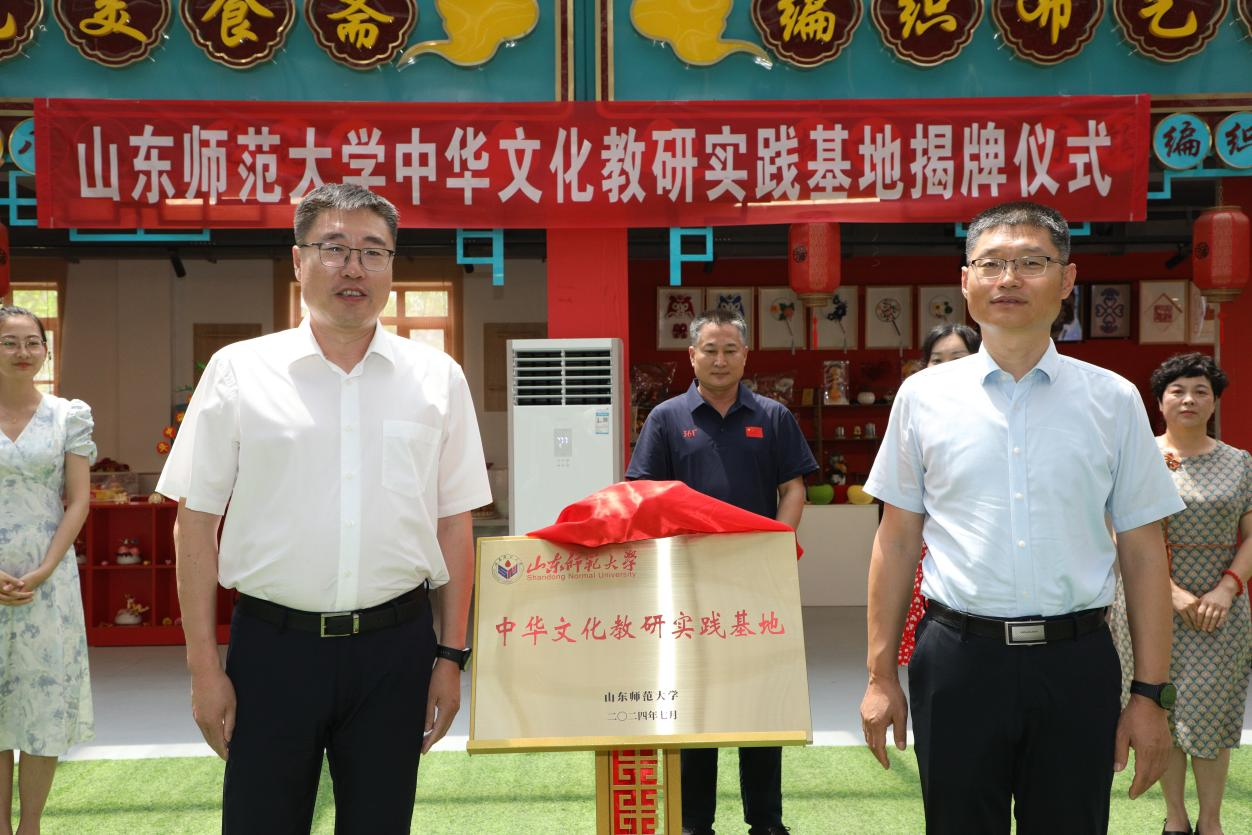 国际教育学院党委书记刘金凯与栖霞市委常委、宣传部部长、市政府副市长张海涛同志共同为“山东师范大学中华文化教研实践基地”揭牌。
