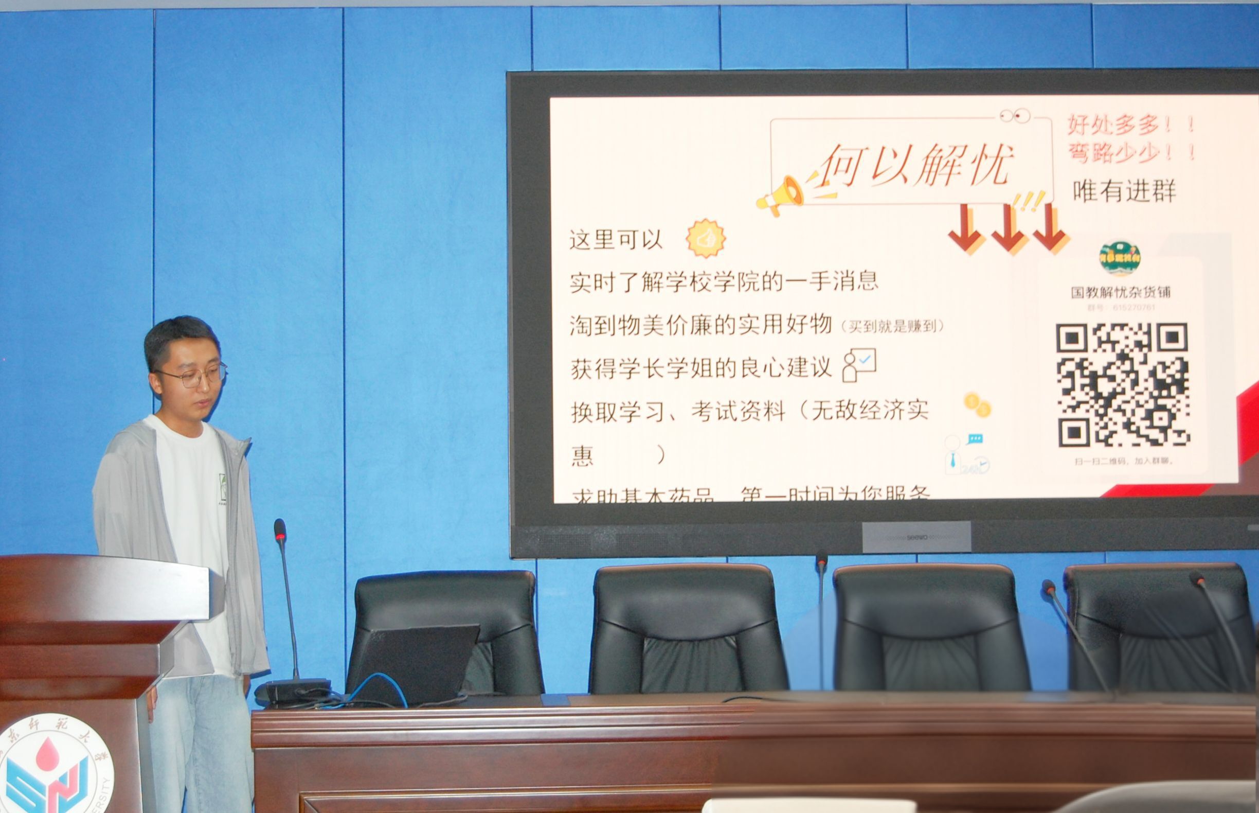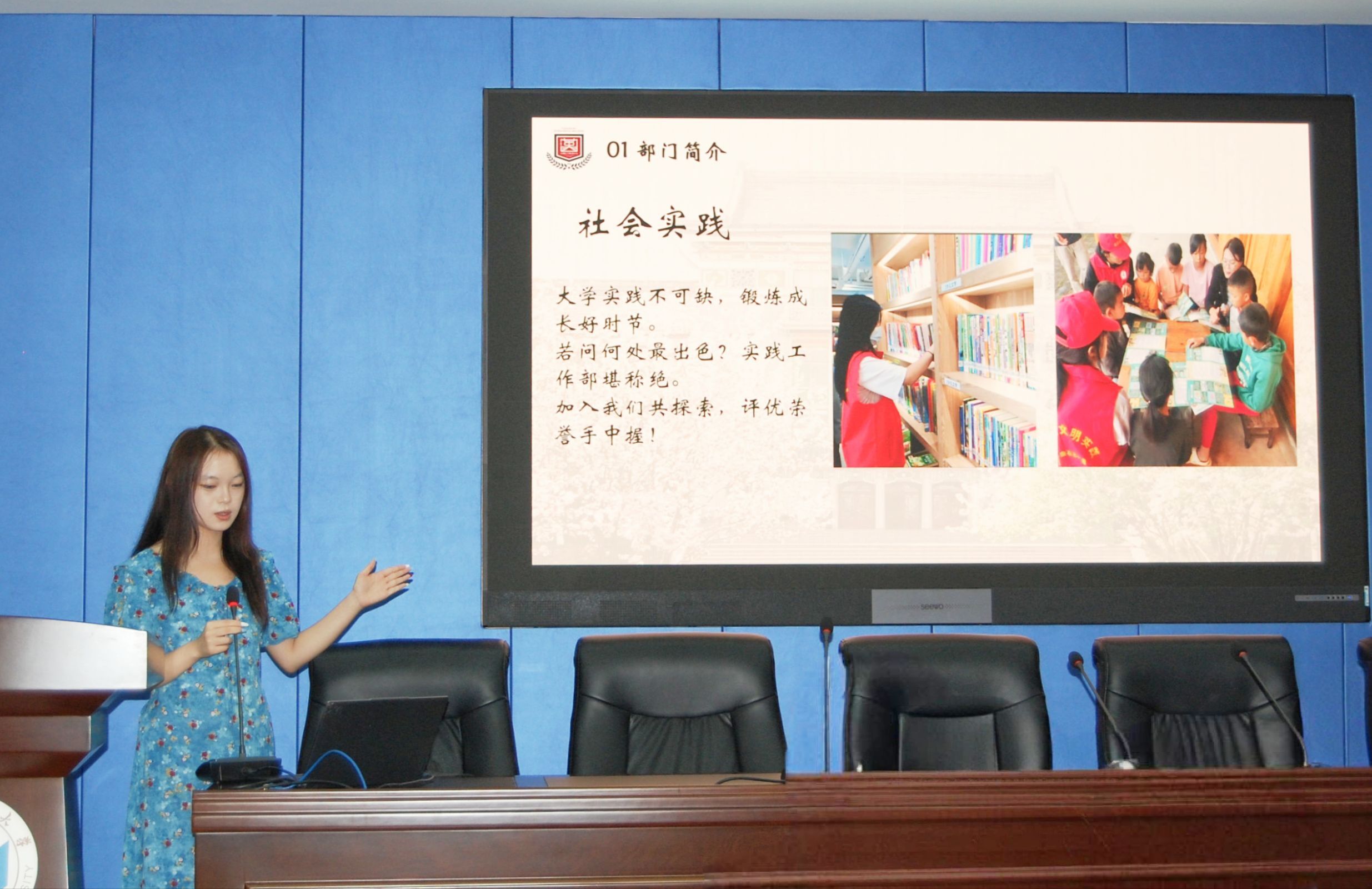 岳宗翔向新生认真讲解了青年志愿者协会多元的活动形式与活泼的团队氛围,同时推荐了附近的休闲娱乐场所,为2025级新生的大学生活开篇致以真切祝福。王文玉介绍了学生会秘书处与实践工作部的大致概况,秘书处围绕人事、财务和日常活动展开,助力学生提升综合协调能力;实践工作部则聚焦社会实践和社团活动,为学生搭建实践成长平台。周莹含介绍了青年发展部和文体活动部的主要工作,青年发展部组织学术竞赛,帮助学生提升学术能力;文体活动部开展多元文体活动,为学生搭建展现自我、丰富生活的平台,鼓励新生积极参与绽放青春风采。刘萧雅展示了宣传部的主要职能,如大型活动跟踪报道、学院平台推送运营、活动跟拍、海报制作等,多维度为学院宣传工作赋能,助力学生提升宣传技能,为学院宣传注入新鲜活力。
