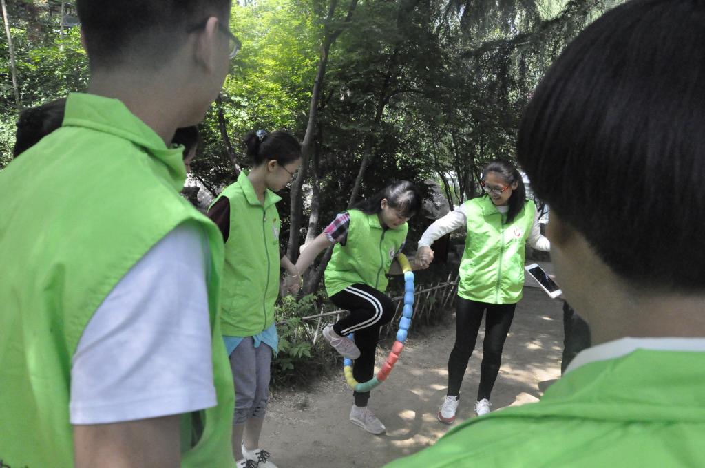 加强彼此认识之后,志愿者们便开始了紧张有趣的团建活动。志愿者们拿着写有任务线索的卡片依次寻找指定地点,社区工作人员在任务地点要求小组人员完成趣味任务,然后发放下一张任务卡。A小组成员的第一条任务线索是“一支队伍,埋伏起来,匍匐在地,只露钢盔”,大家绞尽脑汁,终于灵机一动------蘑菇亭。在第二个任务地点,B小组成员的任务是完成“五人三足”,成员们积极配合,通过“一人背一人、单脚站立”的形式顺利完成了任务。在第三个任务地点,C组成员按要求找到两名游客完成照相任务。三组成员都顺利拿到了最后一张任务卡----“不亦乐乎的安定之所”,大家轻松地猜到最后的任务地点是“快逸亭”,快逸亭位于绿树环绕的假山之上,隐蔽的地理位置对志愿者们来说是不小的挑战。最终,经过志愿者们的激烈角逐,C组率先到达终点,其他组也依次完成任务。