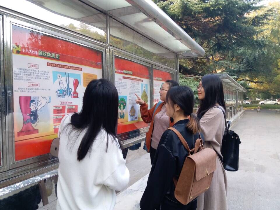 为加强作风建设,增强反腐倡廉意识,进一步帮助全校师生全面、准确、深刻领会“廉政新规定”,学校于1026日同时在千佛山校区东方红广场、长清湖校区C区广场北侧宣传栏举办“十八大以来廉政新规定”图片展。2018112日国际教育学院研究生党支部开展“十八大以来廉政新规定”图片展学习教育活动。早上8点,支部党员及全体团员汇聚在东方红广场的宣传栏前,认真学了党的廉政建设内容。图片展内容充实,引人深思,具有极强的指导性、针对性、示范性。