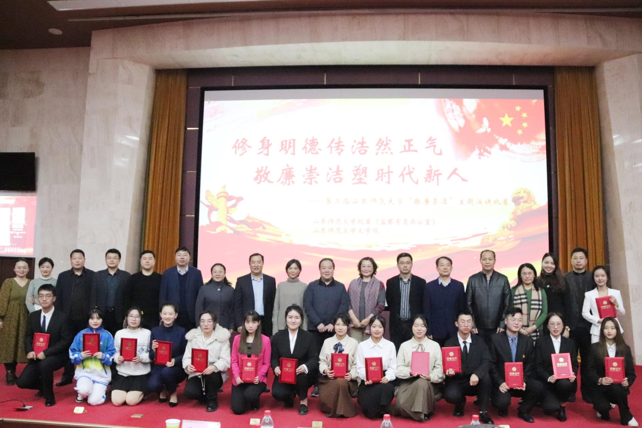 12月2日,山东师范大学第三届“敬廉崇洁”主题演讲比赛决赛在千佛山校区教学三楼报告厅举行。本次比赛由山东师范大学纪委(监察专员办公室)和文学院联合主办,学校纪委副书记兼纪委办公室主任王发科、正处级纪检员王志强,国际教育学院党委书记刘彧,文学院党委书记肖光军,部分选手所在单位分管学生工作的领导出席决赛,300多名研究生、本科生现场观看了比赛。刘静敏、常庆、贾娇燕、张萌、刘亚担任比赛评委。国际教育学院2021级研究生周旦代表学院参加此次比赛。