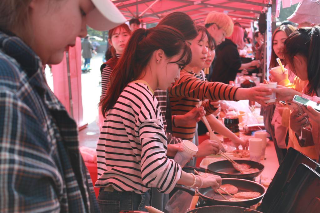 伴随着一阵欢快的音乐声,美食节正式拉开帷幕。由国际教育学院本科生和各国留学生们搭建的摊位上摆满了各种各样的美食:中国的关东煮、汤圆、饺子;韩国的饭团、泡菜饼、炒年糕;俄罗斯的水果沙拉;柬埔寨的椰汁拌饭……各种香气扑鼻的美食不仅吸引了我校师生,同时也吸引了附近的市民朋友们前来观赏品尝。值得一提的是美味的传统荷兰烙饼,从活动伊始便以其独特的香味和口感吸引了大量顾客驻足购买,生意一片火爆。除了鲜美的食物可以满足大家的味蕾以外,五颜六色的各国服装也让在场的各位大饱眼福。留学生们大方热情地向游客们介绍自己国家的美食文化并和他们合照留念,翰丛传统文艺社的同学们身着汉服,手托美食,向大家展示了中国传统服饰和礼仪文化。在活动结束之际,来自巴基斯坦和肯尼亚的朋友们还在广场中央进行了即兴舞蹈表演,引起全场一阵又一阵热烈的掌声。