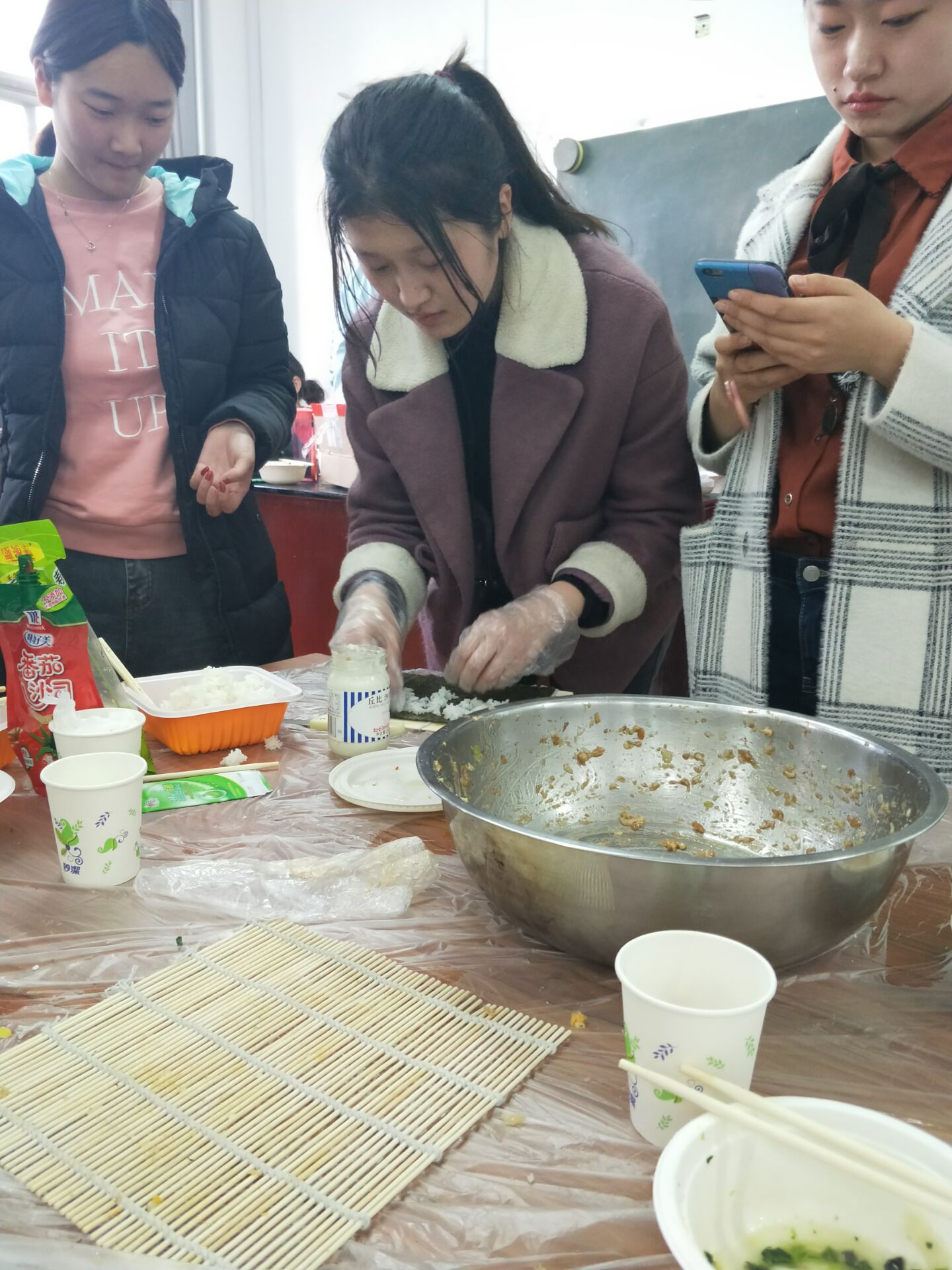 活动前一周,班委们多次开会商讨此次活动内容,协调采购食材,组织人员,安排器具等工作。下午15:40,团建活动正式开始。本次活动包括“包饺子大赛”“创意饺子大比拼”“超级幸运芥末饺子”等,同时还有导员精心准备的丰富大礼包。同学们都包得有模有样,一锅锅饺子下锅,又一盘盘地盛出,香喷喷的饺子冒着热气,同学们都等得迫不及待。包饺子环节过后就是徒手做寿司环节。同学们戴着手套,互相帮忙,同心协力,切出一个个精致的小寿司。在其乐融融的氛围中,同学们度过了开心的两小时,彼此感情迅速升温,和辅导员的距离也迅速拉近,彼此之间不再是刚开学的羞涩和胆怯,而是多了一份信任和关怀。