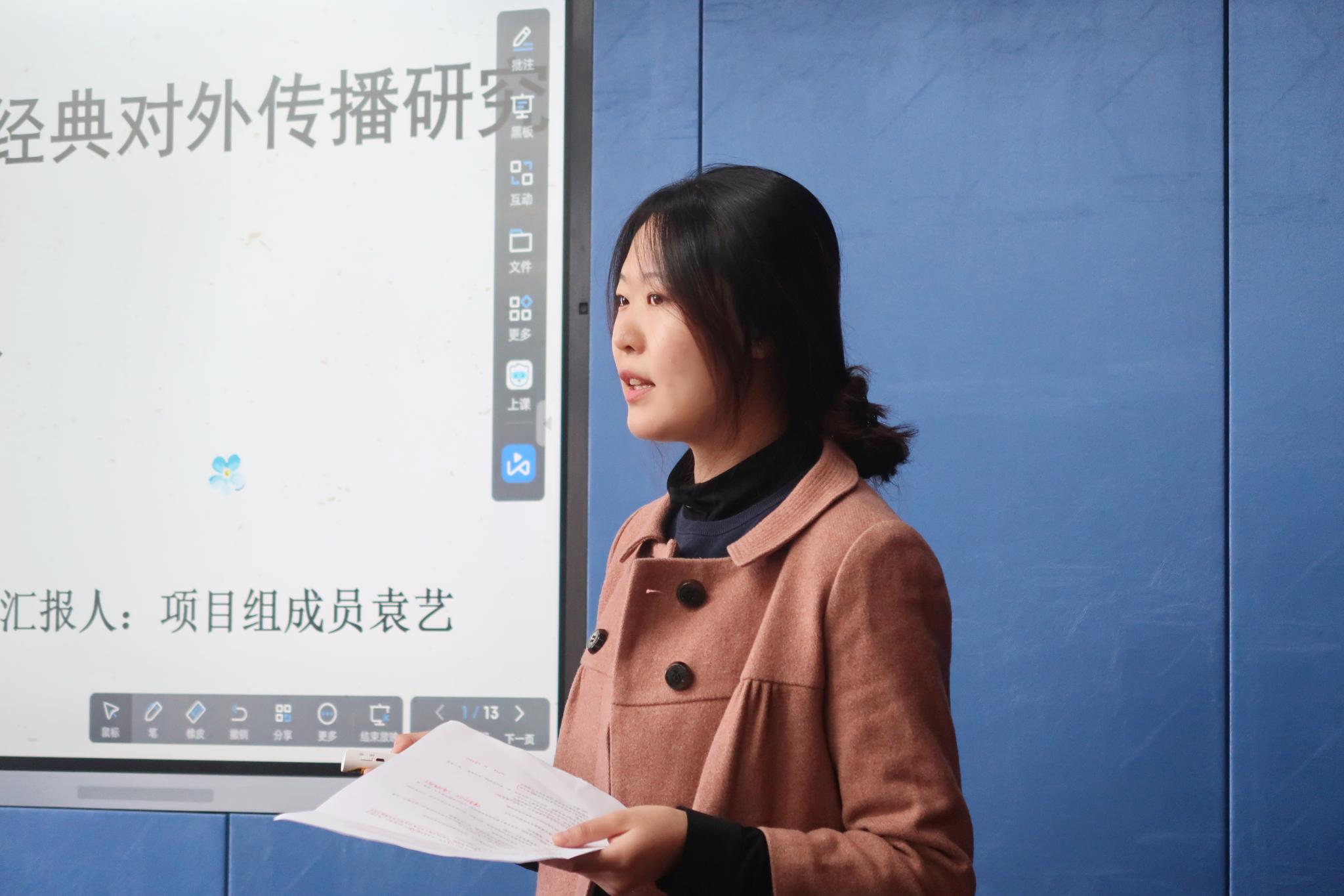 本次结题审核会由路演答辩和评委提问两个环节组成,共10个大创项目组参加。各团队通过详细的项目讲解,回顾了各自创新创业的历程,梳理总结了项目成果及心得体会。会议伊始,宋航莉以唐朝行酒令为例从项目背景、项目内容、项目成果等多个方面展示了基于虚拟技术的对外汉语教学设计项目的发展历程。“欧美影视华人形象变迁历时研究”的负责人徐春暄通过对中华传统人物花木兰的剖析说明了华人形象在欧美影视中的角色演变,表达流畅,论述完整。邓晓玉思路清晰地介绍了团队大创项目“以短视频为载体的对外汉语教学资料库建设及网络运营”,她强调了“师太说汉语”栏目现在所取得的成果及公司的后续发展。在各个大创项目汇报后,孙全志副书记及史洁教授针对不同的项目提出了自己的看法与见解,并根据项目的研究成果给予了整改和完善意见。