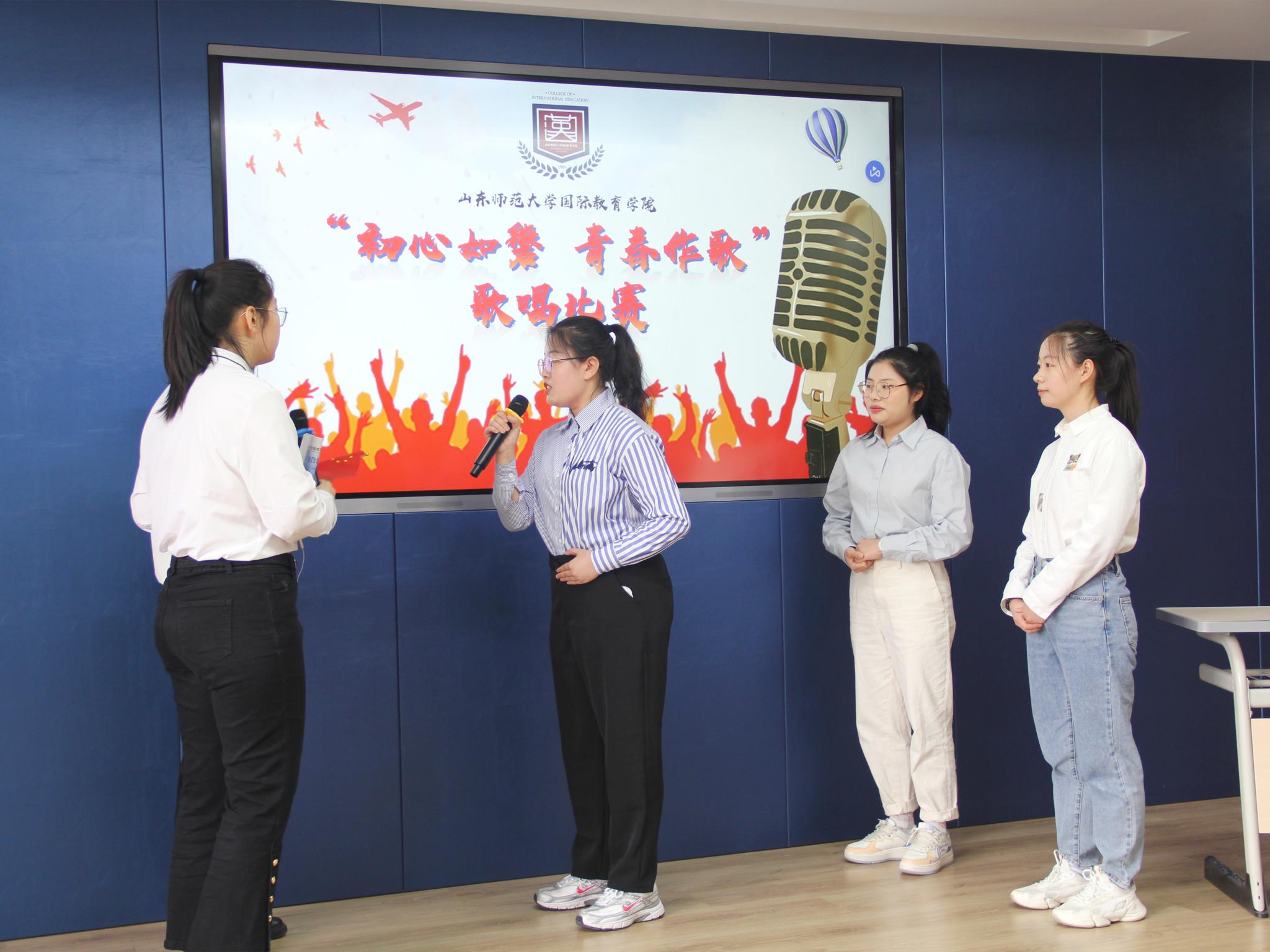 围绕“喜迎二十大,建团百周年”的主题,2022年4月14日,国际教育学院于千佛山校区第三教学楼3544教室举办“初心如磐·青春作歌”歌咏大赛初赛,辅导员刘琪、魏雪玲、院团委副书记周旦、2018届院会主席李芷任到场评审,研究生及本科生同学积极参与其中。