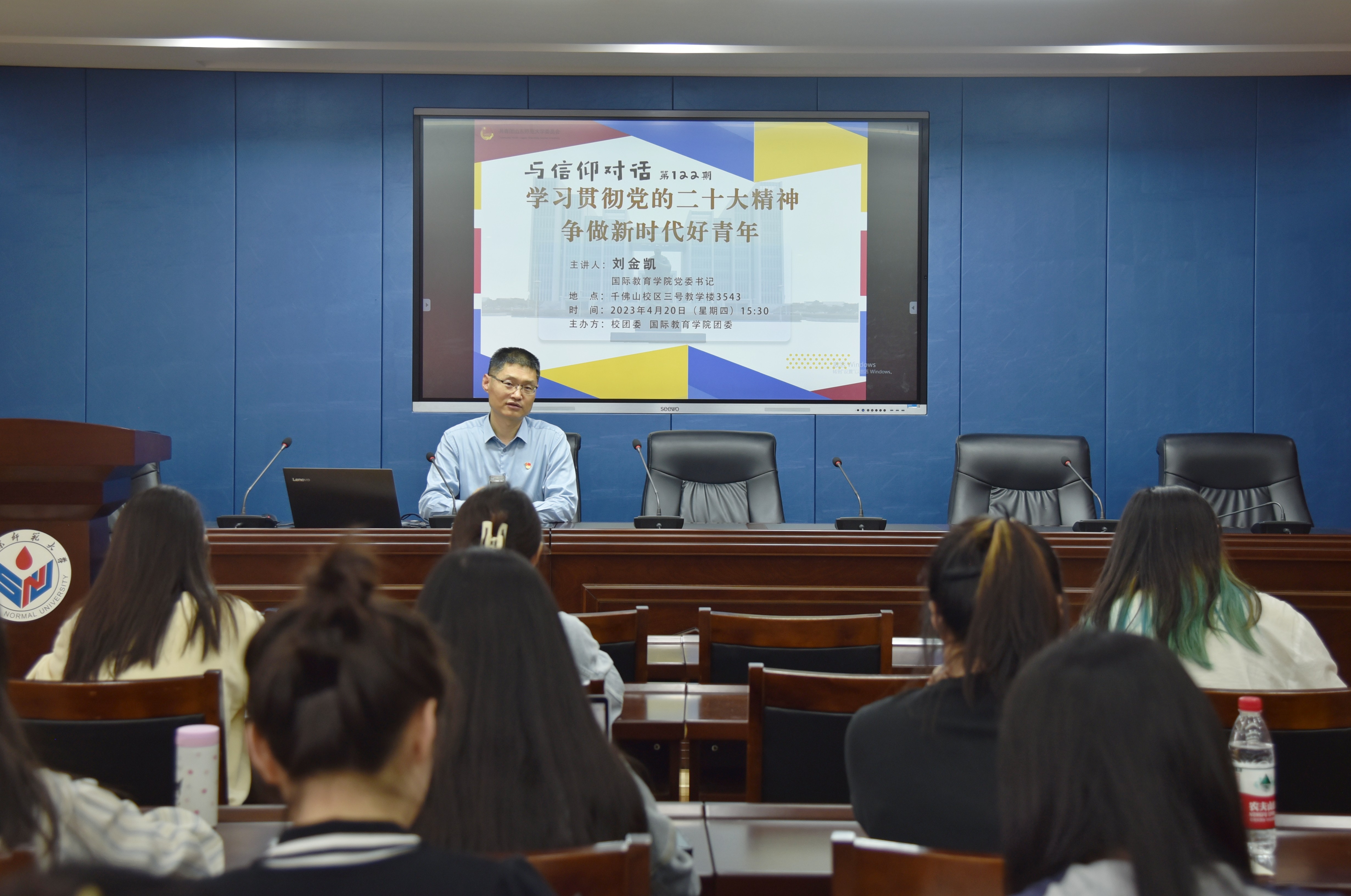 为全面贯彻党的二十大精神,加强学生的思想政治引领,4月20日下午,校团委和国际教育学院团委联合举办的“学习贯彻党的二十大精神,争做新时代好青年”主题报告会于千佛山校区三号教学楼3543教室顺利开展,本次讲座由国际教育学院党委书记刘金凯担任主讲人,学院五十余名学子参与其中。