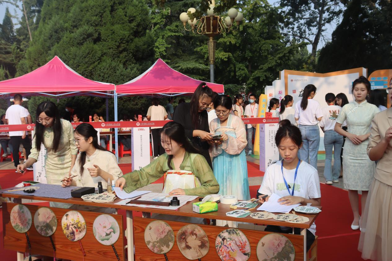 学生志愿者为新生暖心护航——完成身份核验、资料审核、礼包发放等工作,礼包内包括美观实用的笔记本、钥匙扣、文件夹等。为增加入学仪式感,学院特安排专员身着汉服,现场制作文创,在系有各色流苏的祝福团扇上书写新生姓名,并特邀留学生现场迎新,传递出学院对学子的诚挚心意,营造了多元而丰富的迎新氛围。