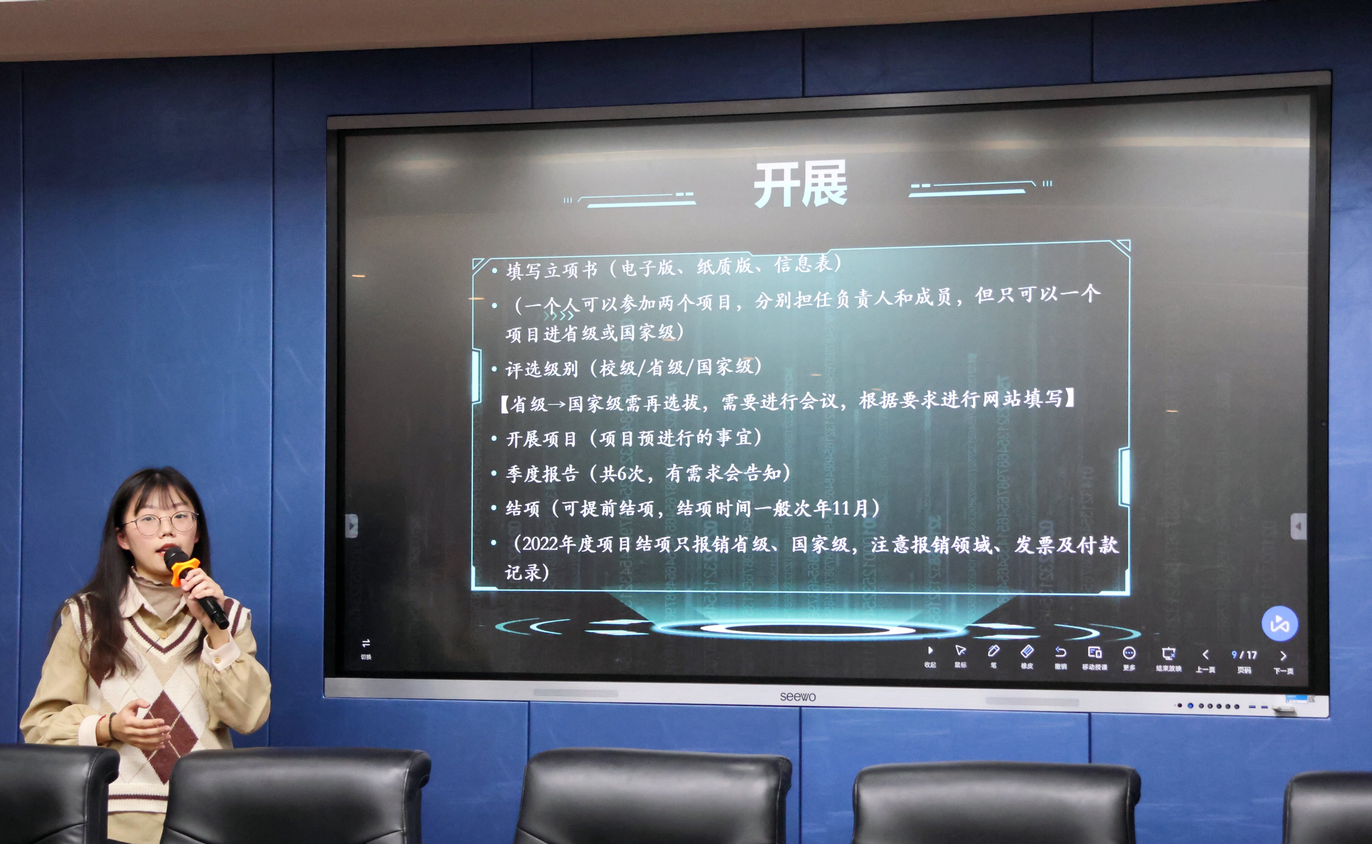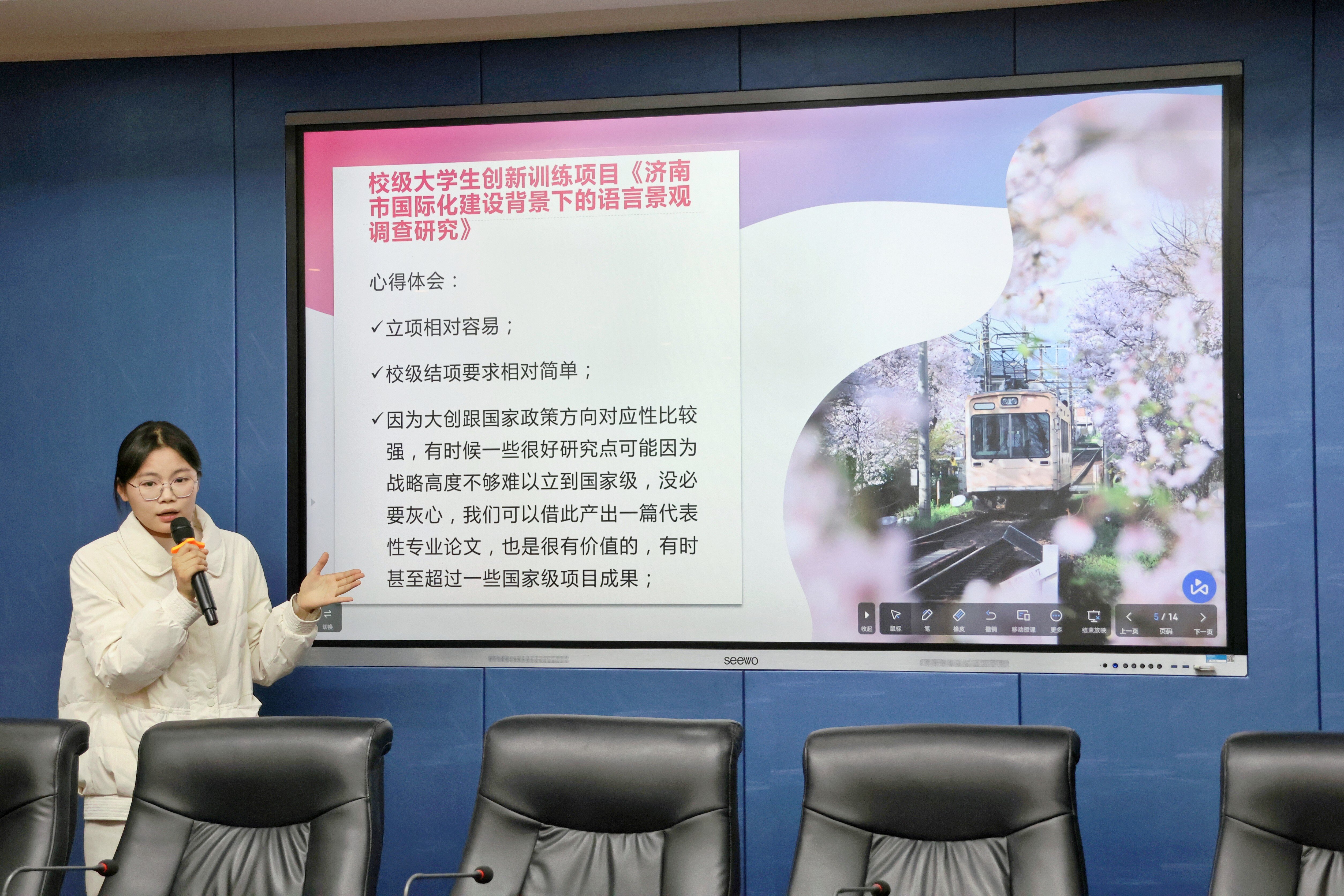 为加深学生对科研赛事的理解,提高学生创新创业备赛水平,11月24日,国际教育学院于千佛山校区第三教学楼3543会议室顺利举办“似火青春,创流不息”青年科创沙龙分享会。本次会议由学院学生会实践工作部志愿者赵菲担任主持人,2020级保研优秀学子臧卓然、李超琦、宋梦露依次上台分享经验,学院30余名学生代表到场参会。