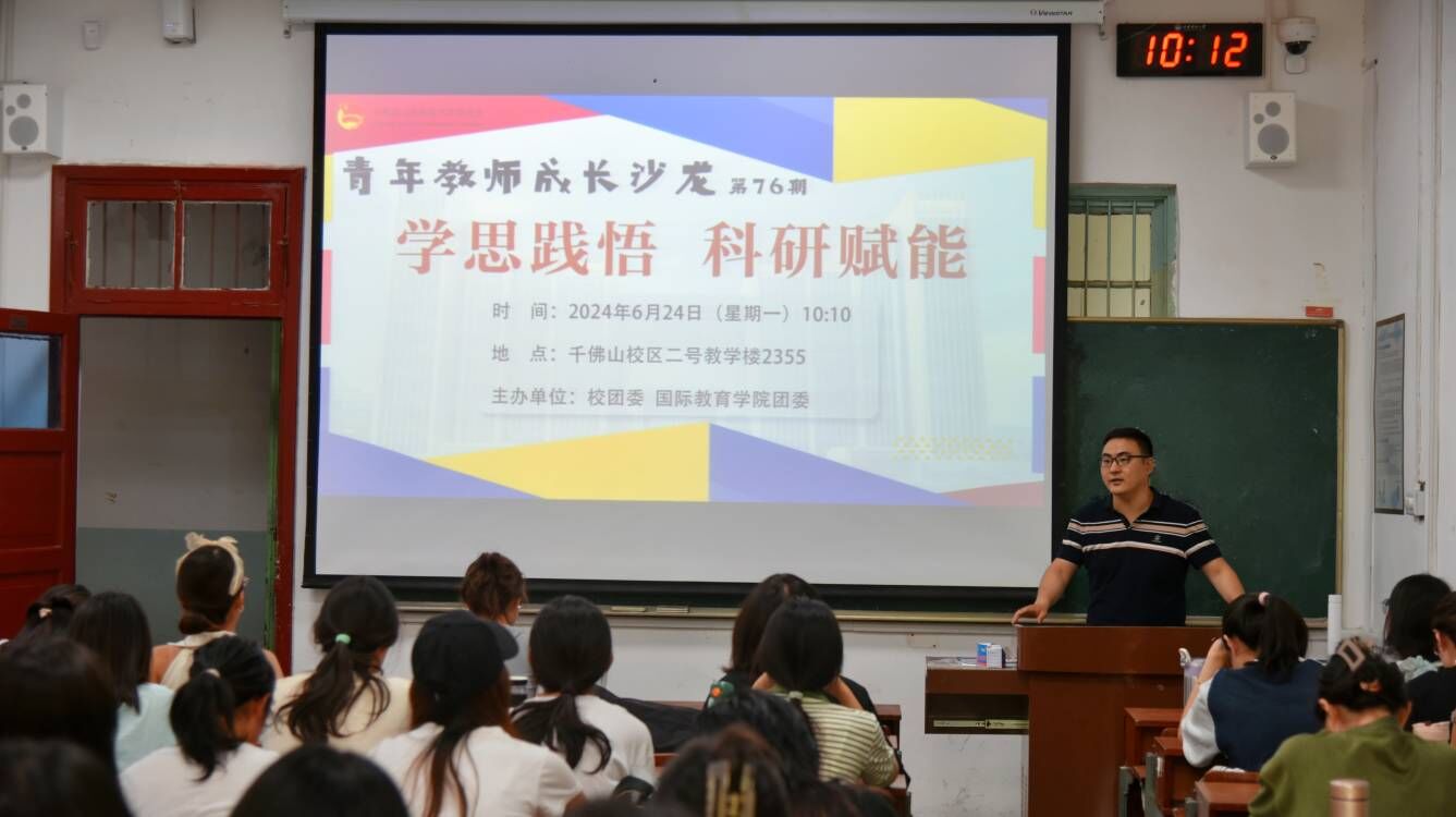 2024年6月24日上午,由校团委、国际教育学院团委主办的“学思践悟,科研赋能”第76期青年教师成长沙龙于千佛山校区二号教学楼2355教室举行。国际教育学院教师黄长彬担任主讲人,2022级全体学生到场参加。