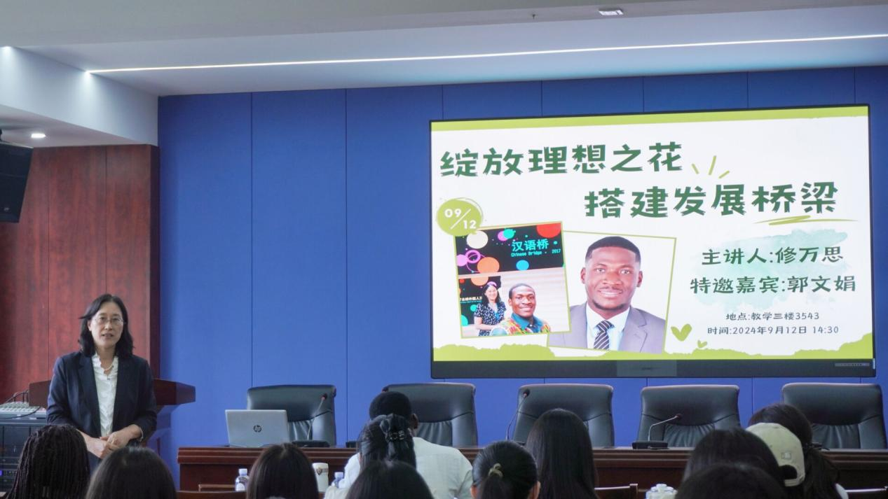 郭文娟简要介绍了修万思的求学和工作经历,对他此次回访母校、开展讲座致以热烈的欢迎。适逢第四十个教师节刚过,修万思也用实际行动表达了对母校和恩师的感谢。在山师的留学生涯是他人生中的重要经历和宝贵财富,他回忆了从初识中文到参加“汉语桥”比赛的点点滴滴,告诫同学们机会只垂青有准备的人。语言是思想的载体,语言是文化的钥匙。在“全心全意为人民服务”精神的指引下,修万思回国后创办了“加纳汉语说者协会”“非洲青年领导力培训中心”等公益平台,希望通过这些平台促进加纳人民的汉语学习,同时,助力加纳青年改变思想,提高领导力,服务国家发展。在交流互动环节,他回答了中外学生关于中文学习的意义和建议、文化差异与跨文化交际等相关问题,鼓励大家一定要怀揣梦想、树立目标、用心向学、砥砺前行!