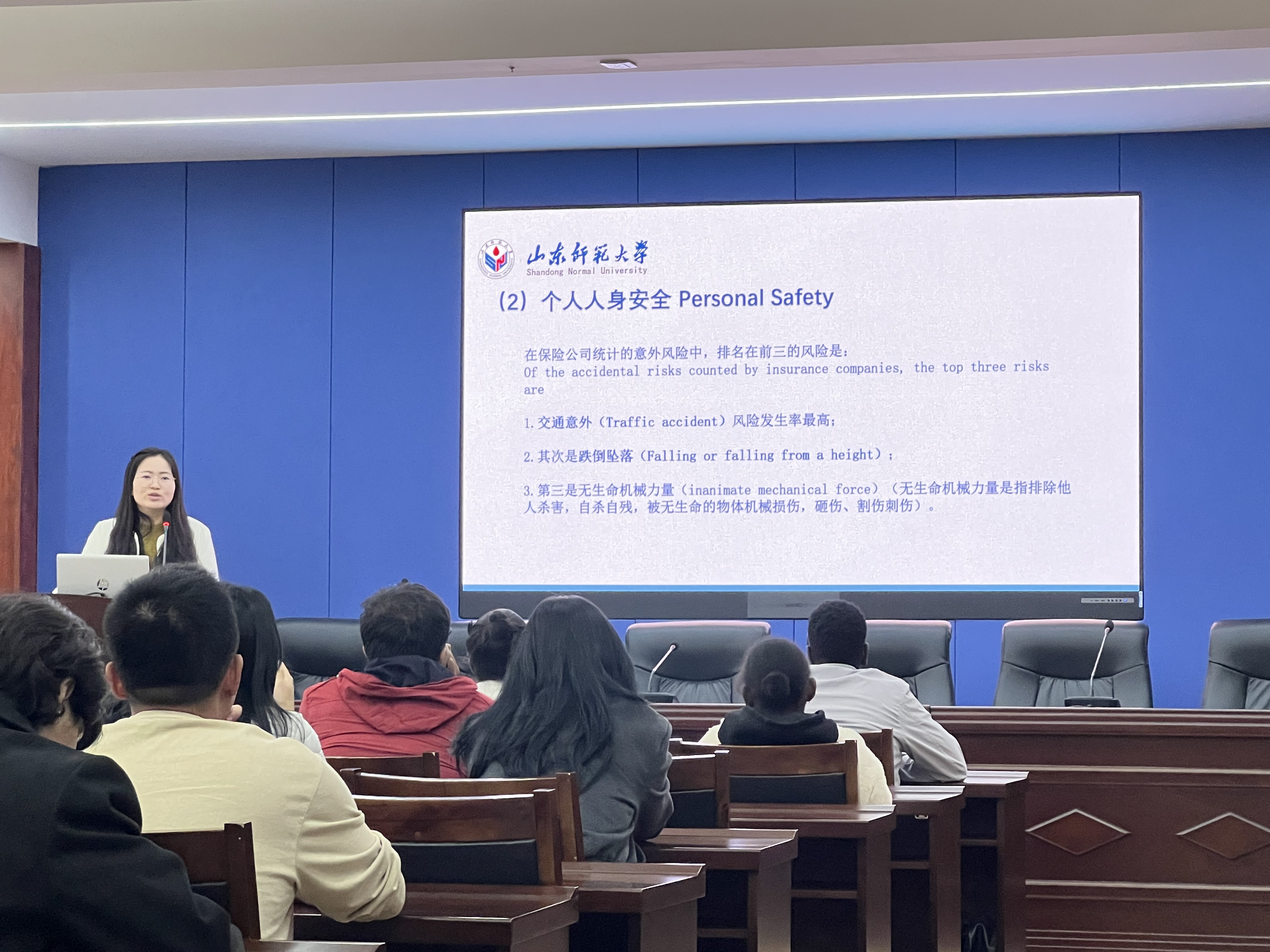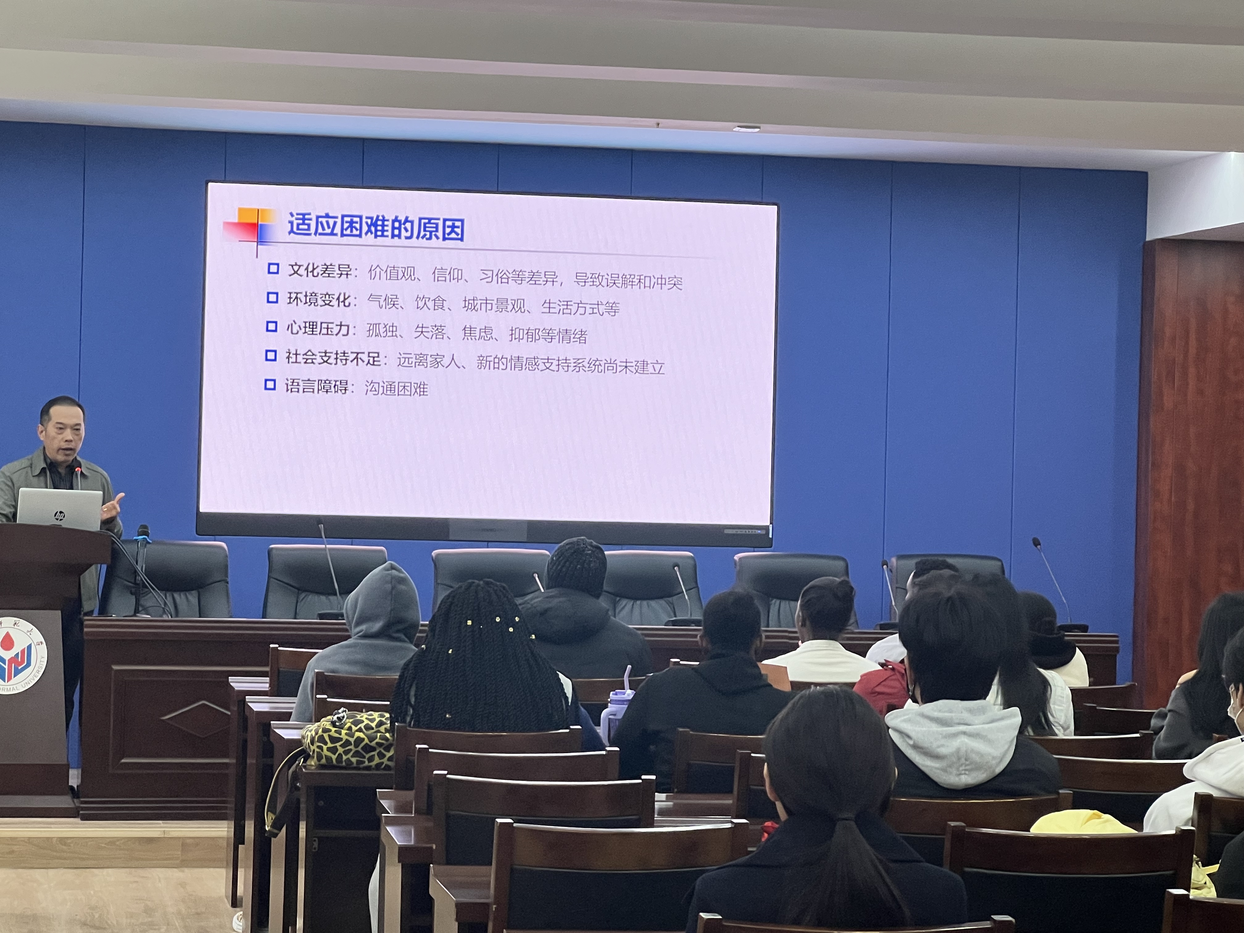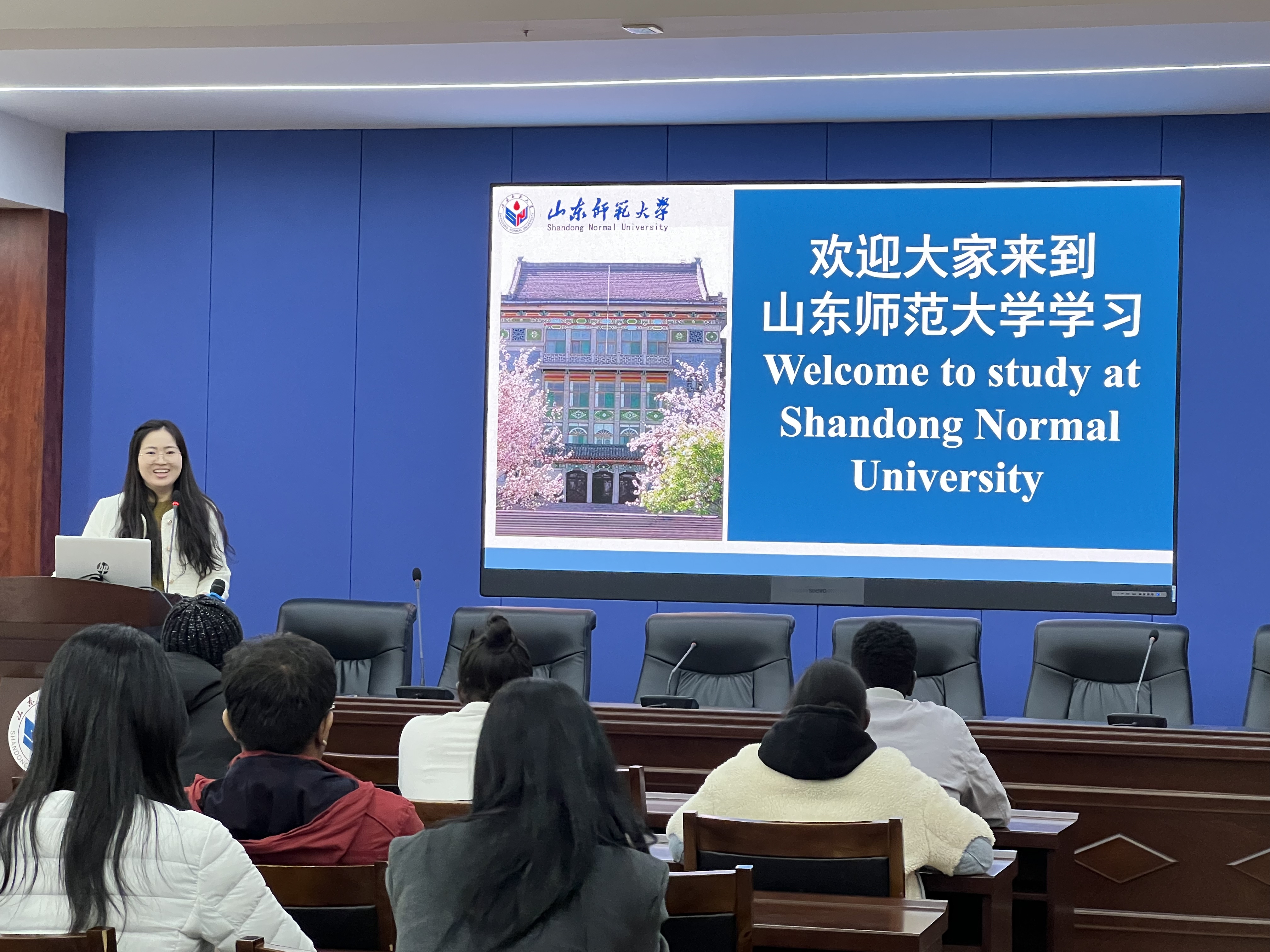留学生工作办公室张美乐老师从学校简介、规章制度、安全风险防范、专业学习要求、学校国际学生管理体系及管理老师联系方式、国际学生就业指导几个方面介绍了与国际学生来华学习、生活息息相关的信息,帮助国际学生尽快适应在华生活,更好地投入专业学习。