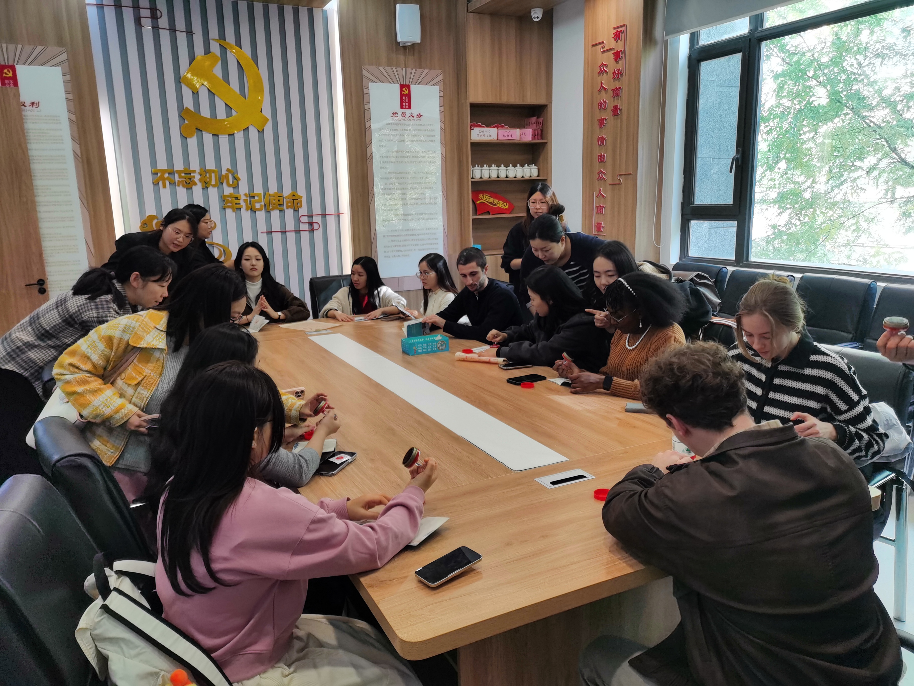 在社区议事厅,同学们听取了工作人员对社区的介绍,文恒社区是一个综合型社区,既有商住一体小区,又有企业商铺,业态丰富,民情民意多样。社区在实践探索中创造了一系列具体有效的工作方法,如“1355”协商议事机制,通过党建引领、三事分流、五事协商、五方会谈,打造“邻里共治、邻里共享”现代化社区,让居民参与到社区管理中,成为社区主人翁。再如关爱老年人的“叮咚,我来了”和“长者食堂”,为社区老年人提供生活便利,也促成老年人自我价值的展现与发挥。丰富的社区建设案例,让留学生们以小见大,真切地感受到中国特色社会主义基层民主的广泛性、有效性和全过程性,理解了“基层群众自治制度”是如何落实在生活中,实实在在为人民服务的。最后,同学们一起朗读了“左邻右帮”“邻里善治”“有事好商量,众人的事情由众人商量”,将生活所见与课程学习内容自然地联系了起来。