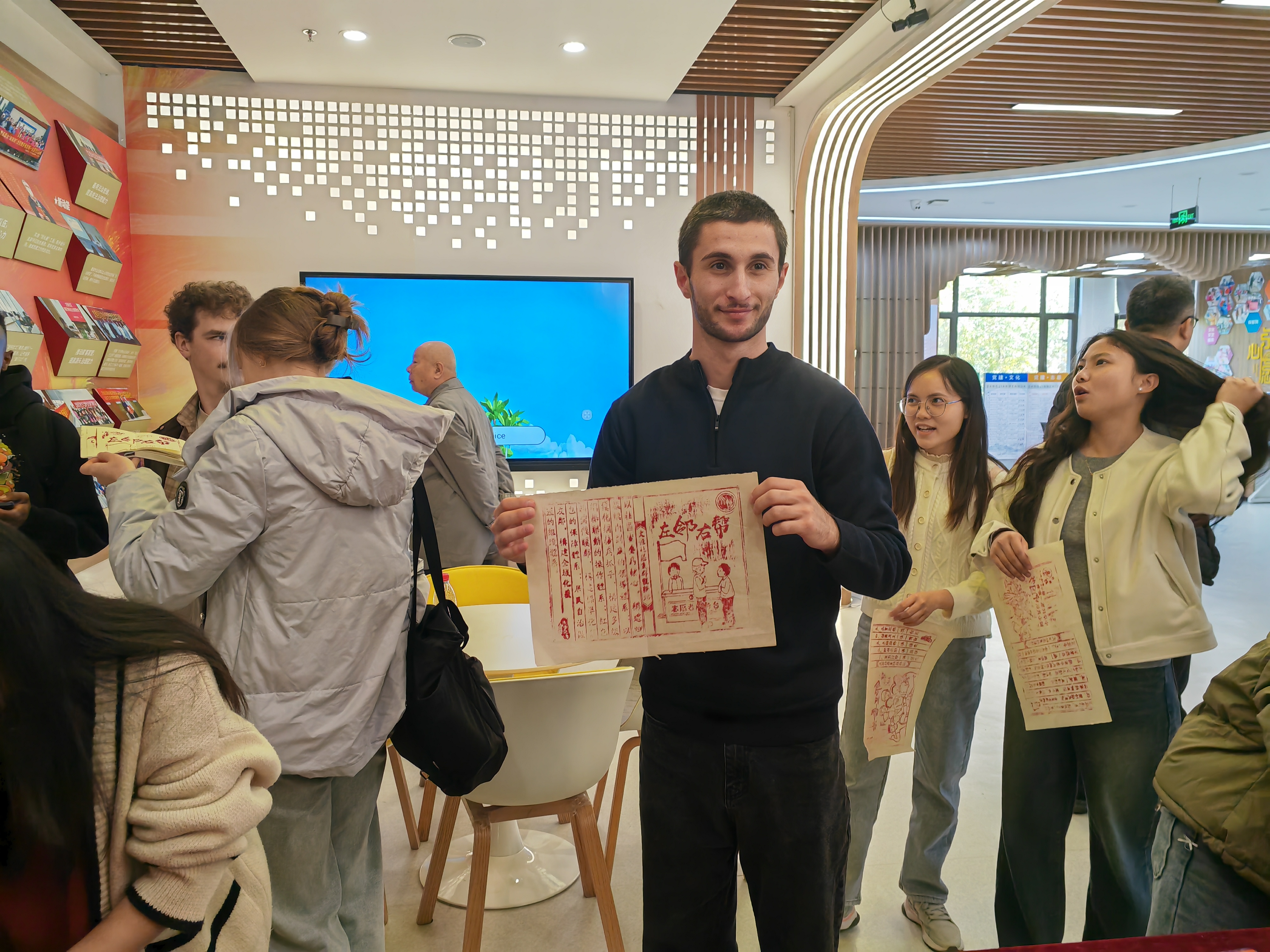 义诊正在进行,医疗专家们帮助居民和留学生检查眼睛、测量视力,普及爱眼护眼知识。雕版印刷体验区域,在工作人员的示范和指导下,同学们纷纷动手制作自己的拓印作品,在模板上用滚轮刷油墨,轻轻放上宣纸,耐心拍打,印出一张张图像生动、文字丰富的画作,他们三五成群,认真地辨识画中的文字,在不知不觉中学习了汉语知识,接受了中华文化的熏陶。