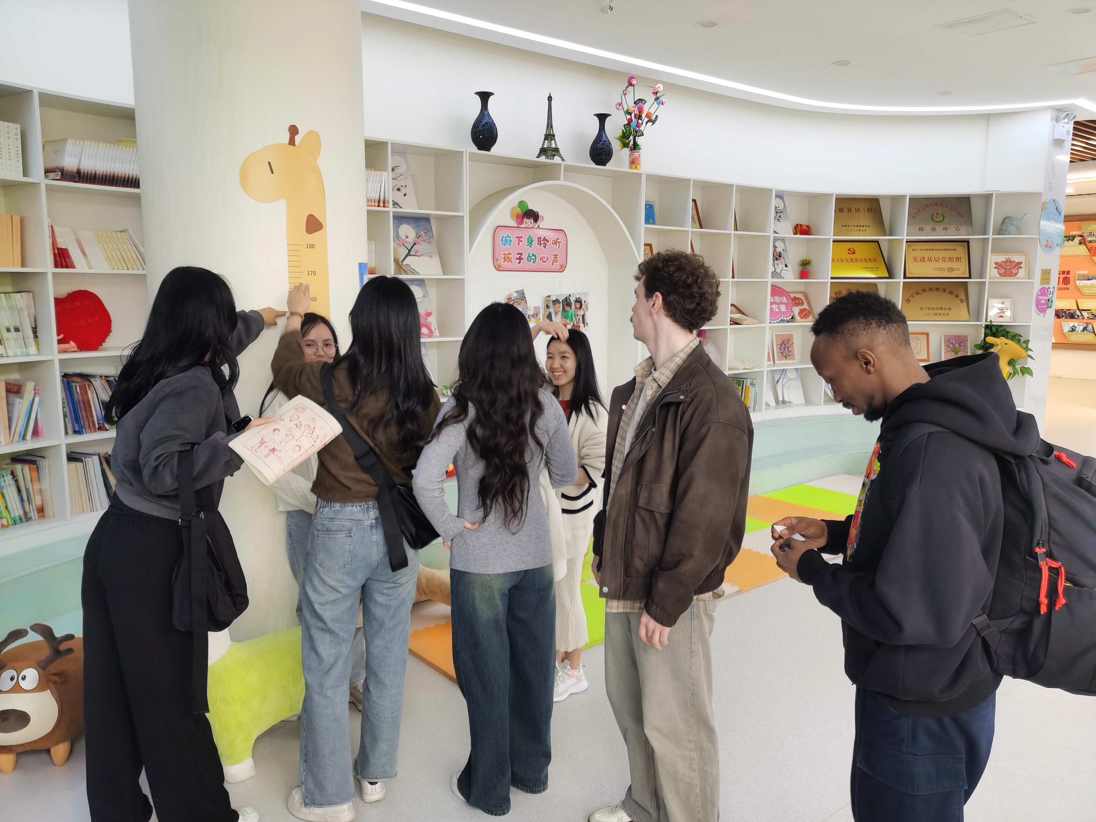 900多平米的空间完全开放,国际事务区旁边是儿童活动区,看到那么多五颜六色的玩具,留学生们瞬间化身小朋友,兴致勃勃地玩起来。对面的阅览区,满架的图书和舒适的沙发构成了一个静谧的空间,很适合阅读。