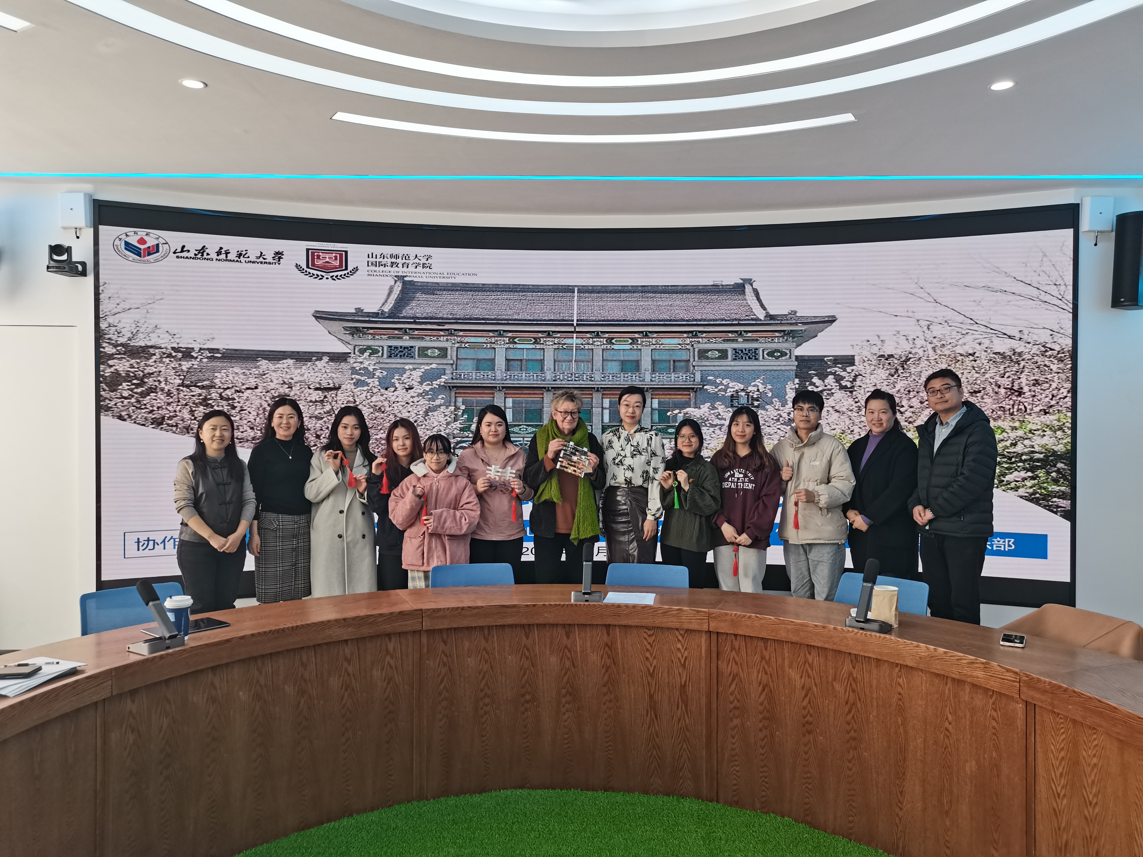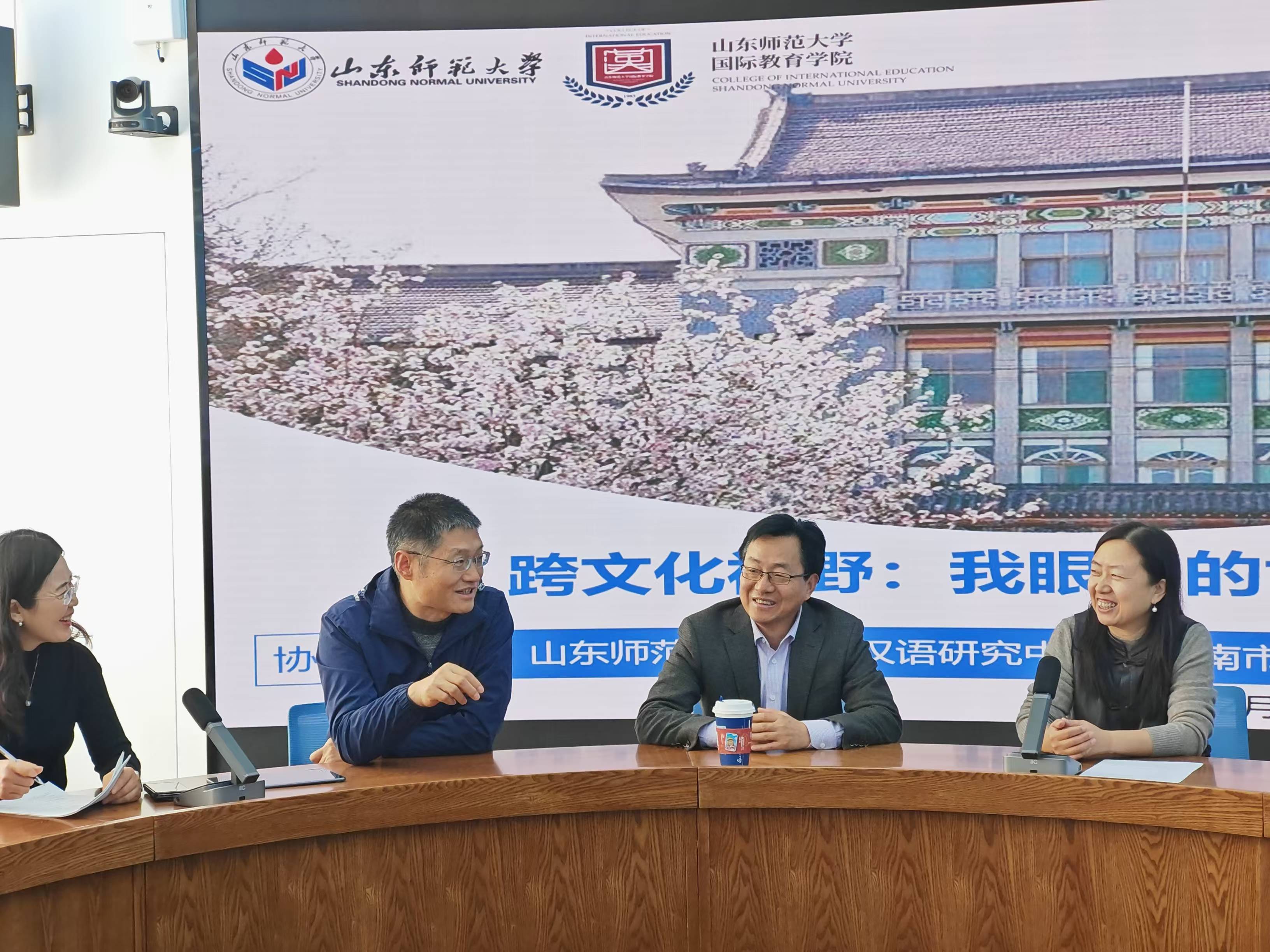 2024年12月18日上午,由山东师范大学对外汉语研究中心、济南市导游协会以及"三人行"徒步运动俱乐部联合主办的"跨文化视野:我眼中的世界自然和文化遗产"产教融合校地(企)共享交流会在千佛山校区教学三楼国际教育学院3516智慧教室成功召开。山东师范大学国际教育学院刘金凯书记、马茂祥院长,济南市导游协会骨干成员王玉、张蕾、邱爽,济南市“三人行”徒步运动俱乐部骨干成员栾全慧出席,学院部分国际学生参加分享会。