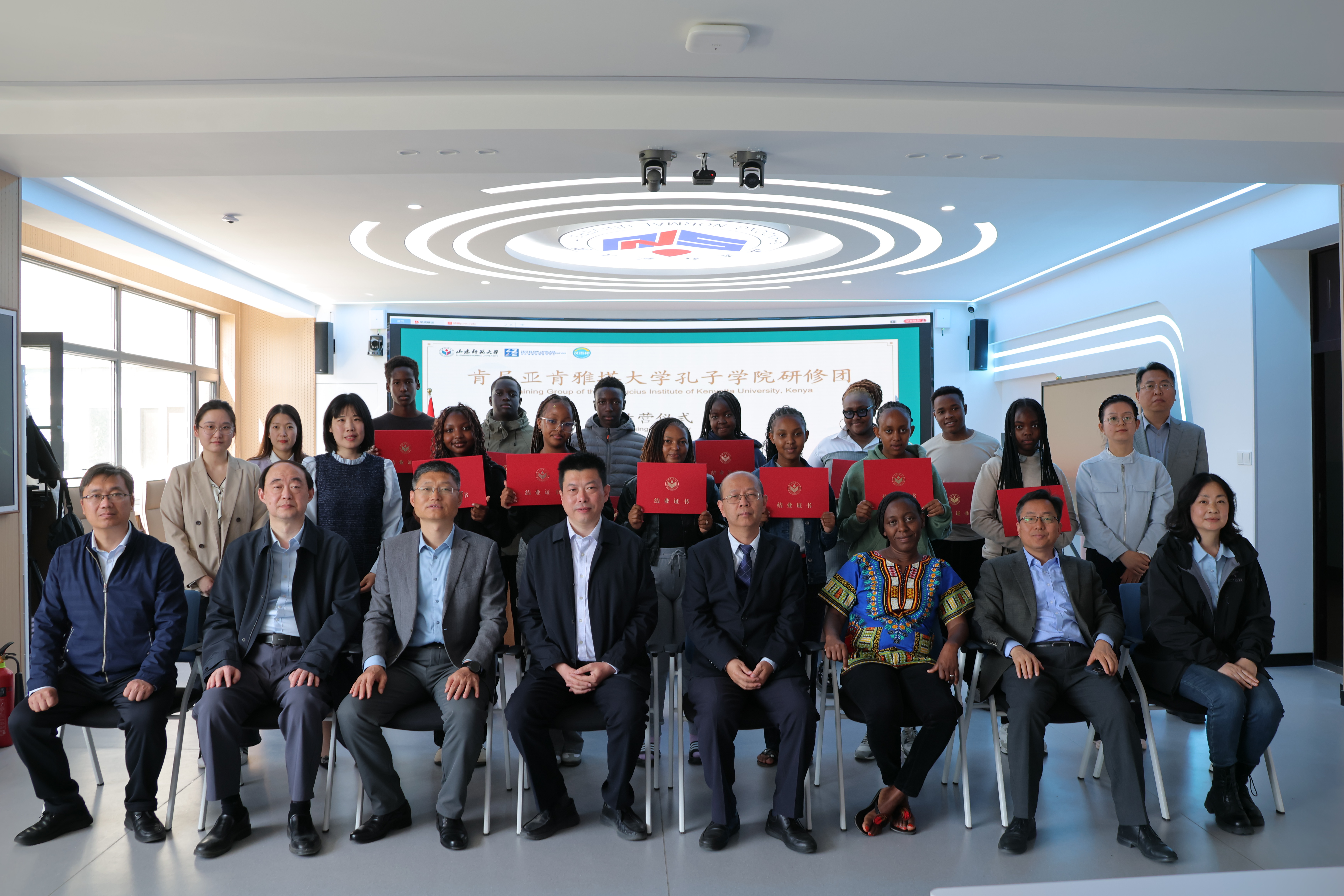 北京时间4月15日上午,由教育部中外语言交流合作中心主办、山东师范大学国际教育学院(留学生工作办公室)承办的2025年“汉语桥”来华团组交流项目——肯尼亚肯雅塔大学孔子学院研修团顺利结营。肯雅塔大学孔子学院中方院长周晓东、国际教育学院(留学生工作办公室)党委书记刘金凯、国际教育学院(留学生工作办公室)院长、主任马茂祥、留学生教育系系主任常庆丰、教师代表贺莉娜及肯雅塔大学孔子学院研修团带队教师和研修团全体师生、留学生工作办公室相关教师、志愿者参加了结营仪式。留学生工作办公室吴燕妮主持仪式。