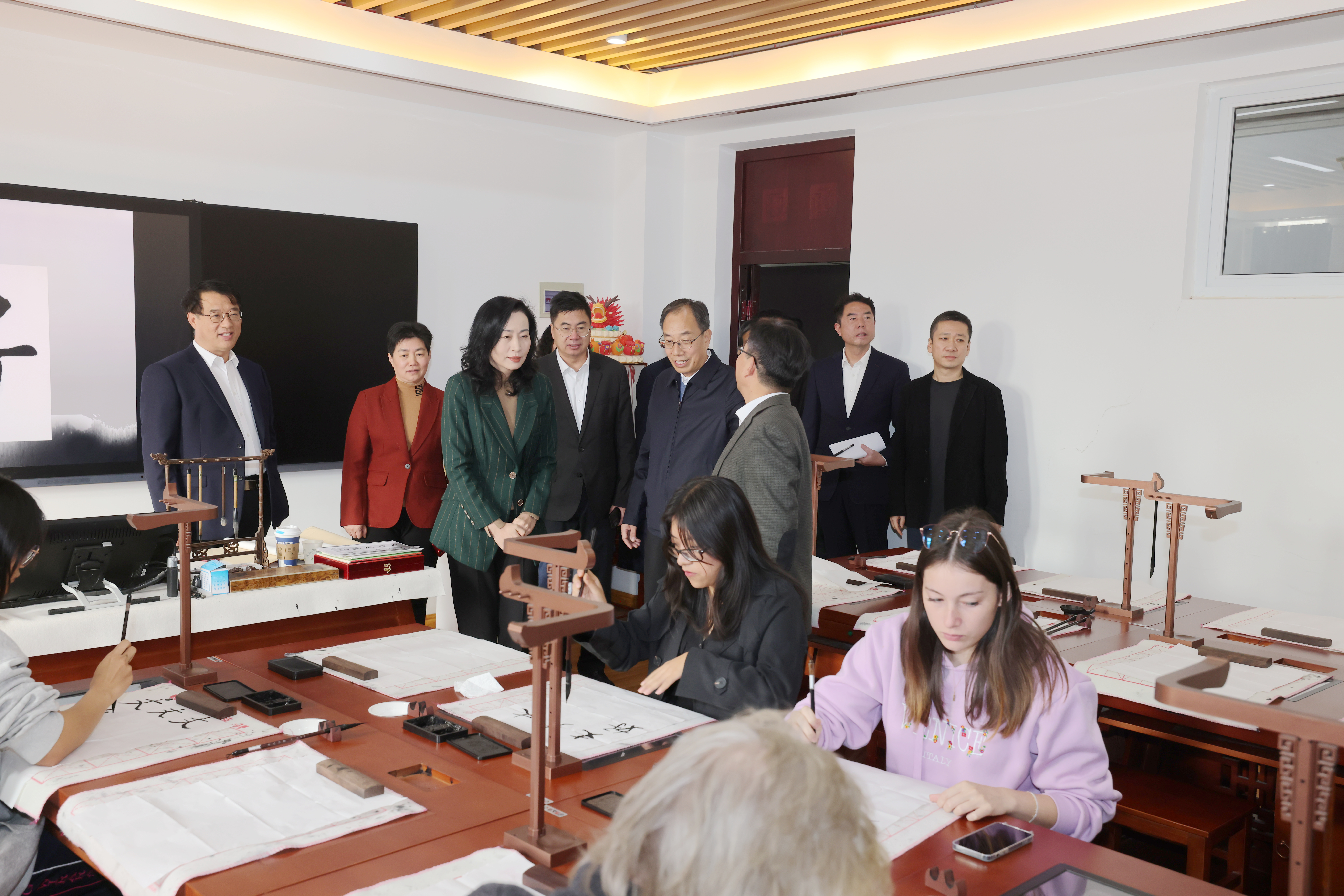 陈白薇与冯继康实地考察了学院教学环境,走进国际学生课堂了解学习情况,并在中华文化体验室观摩了学生练习中国书法、制作漆扇等文化实践课程。陈白薇表示,作为山师校友为国际学生的成长感到欣慰。她鼓励同学们不仅要专注学业,更要深入感知山东文化与中华文明的魅力,积极参与“山东之友”等交流活动。她指出,每位国际学生都是一粒友好的种子,期待大家未来成为中外文化交流的桥梁与使者。