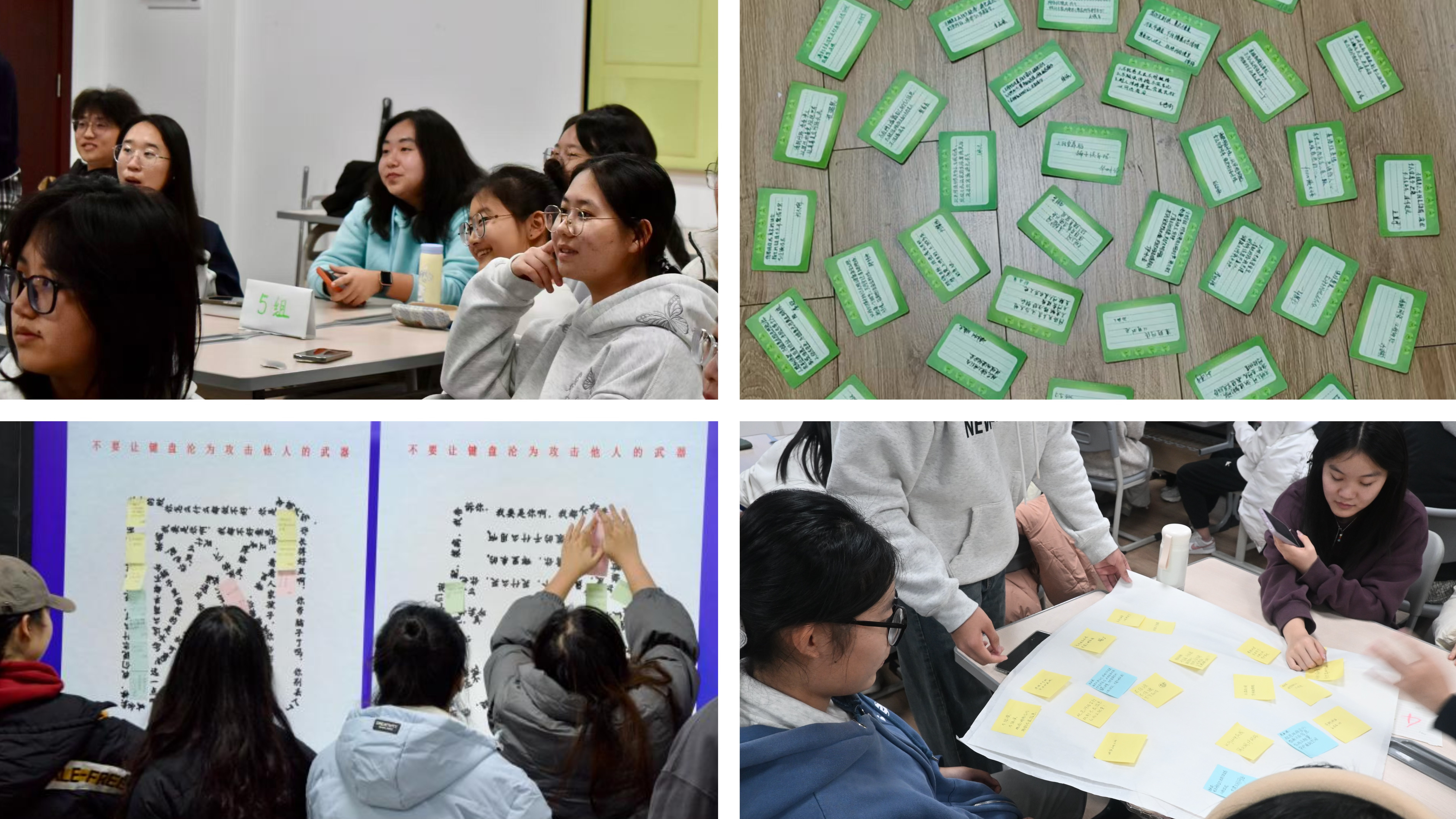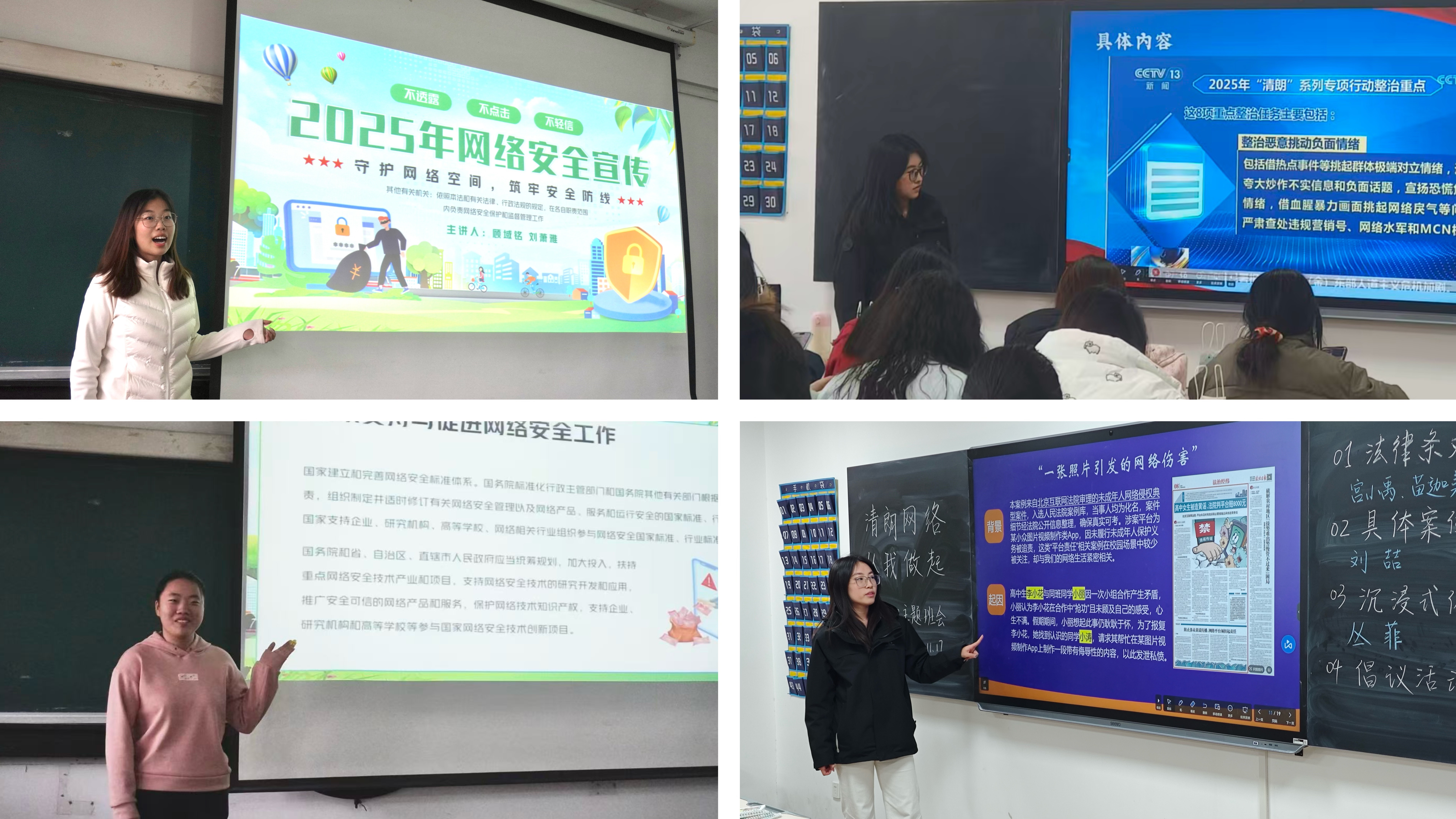 活动以提升学生网络素养为目标,通过系统学习网络安全法律法规、深入剖析典型网络案例、共同制定班级网络文明公约等形式,着力引导学生树立正确的网络价值观,筑牢网络行为法治底线。实施过程中,各班级创新应用多元形式,汉教本2301班聚焦网络言论边界与媒介素养提升,深化专业育人内涵;2302班组织开展典型案例深度研讨,围绕网络谣言、网络暴力等现实案例进行多维度解析;2401班创设真实情境问答,培养学生应对网络风险的实践能力;2402班引入沉浸式剧本杀教学环节,使学生在情景体验中深刻认识网络乱象危害;2501班通过“谣言找茬赛”“谐音梗大赛”等互动激发学生参与热情,增强对网络谣言的辨识力;2502班则开展情景模拟与网络信息辨别挑战赛,结合涉外网络场景,强化文明用网意识。各班同步推进《班级文明上网公约》制定和《文明上网承诺书》签订工作,将集体共识转化落实为具体行为规范,充分展现国教学子在构建清朗网络空间中的专业素养与责任担当。