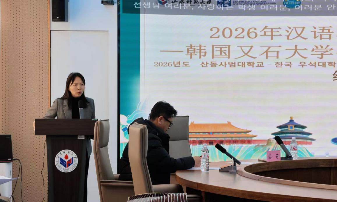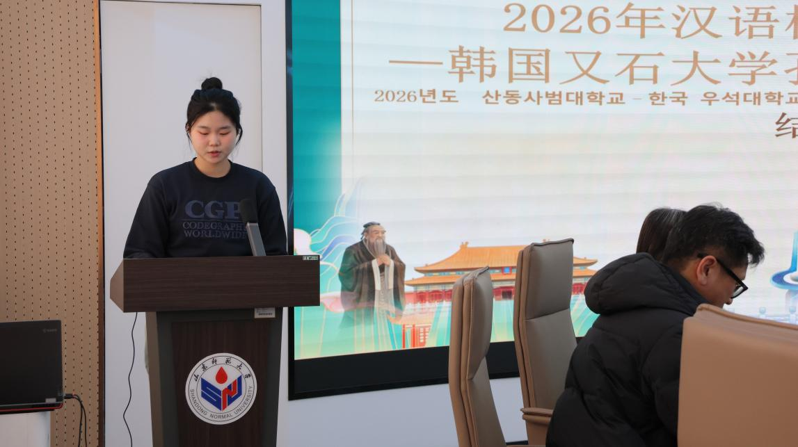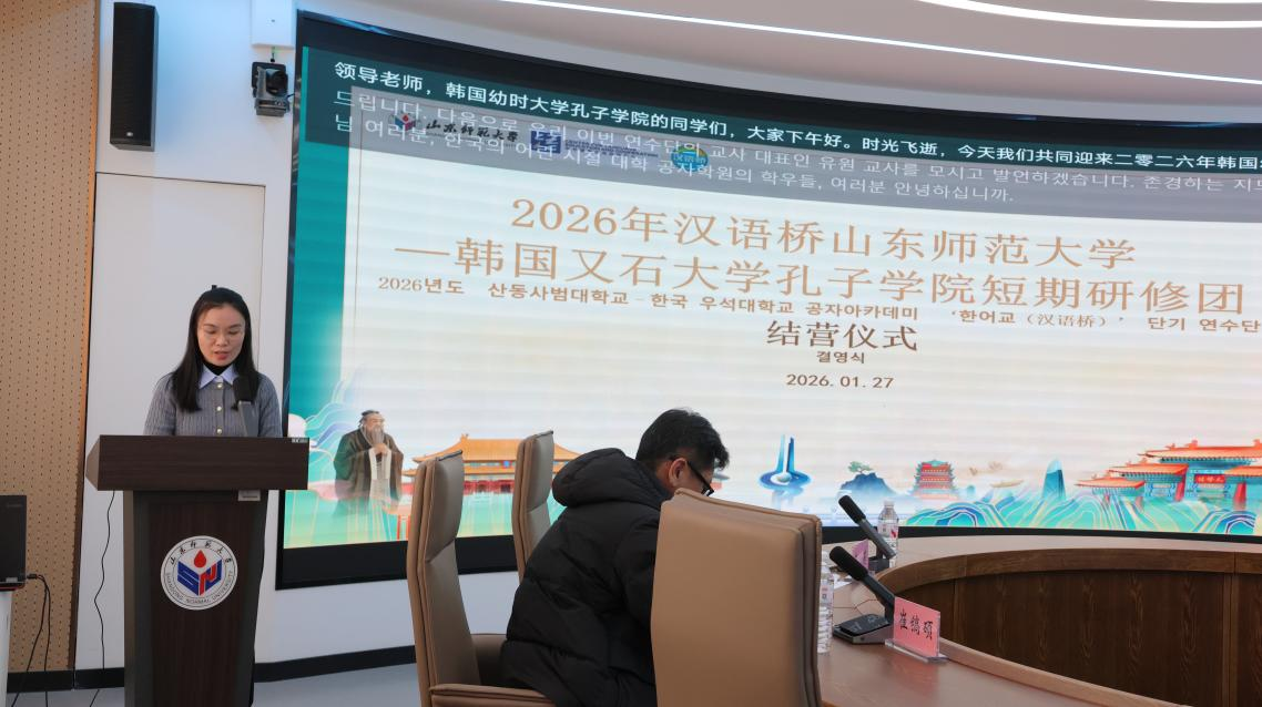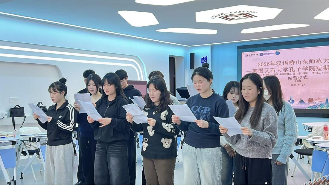 2026年1月27日下午,由教育部中外语言交流合作中心主办、山东师范大学国际教育学院承办的2026年“汉语桥”来华团组交流项目——韩国又石大学孔子学院冬令营顺利结营。山东师范大学国际教育学院党委书记刘金凯、留学生教育系系主任常庆丰、韩国又石大学孔子学院中方院长蔡莉、韩方带队教师崔镐硕、研修团任课教师代表刘园以及13名韩国学员、1名乌兹别克斯坦学员和全体志愿者参与了结营仪式。仪式由国际教育学院留学生招生科科员西茹静主持。