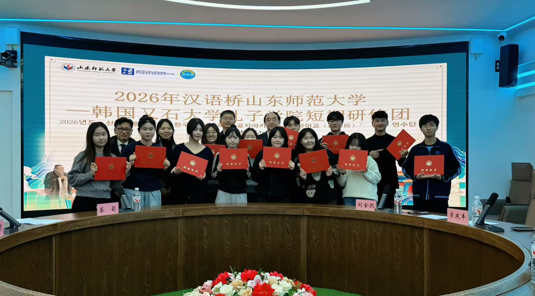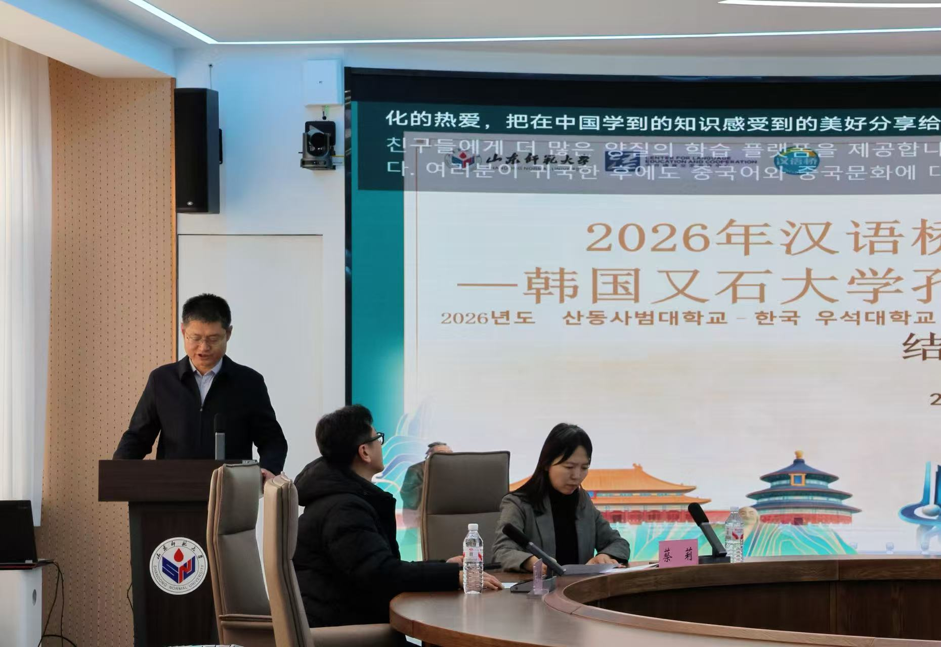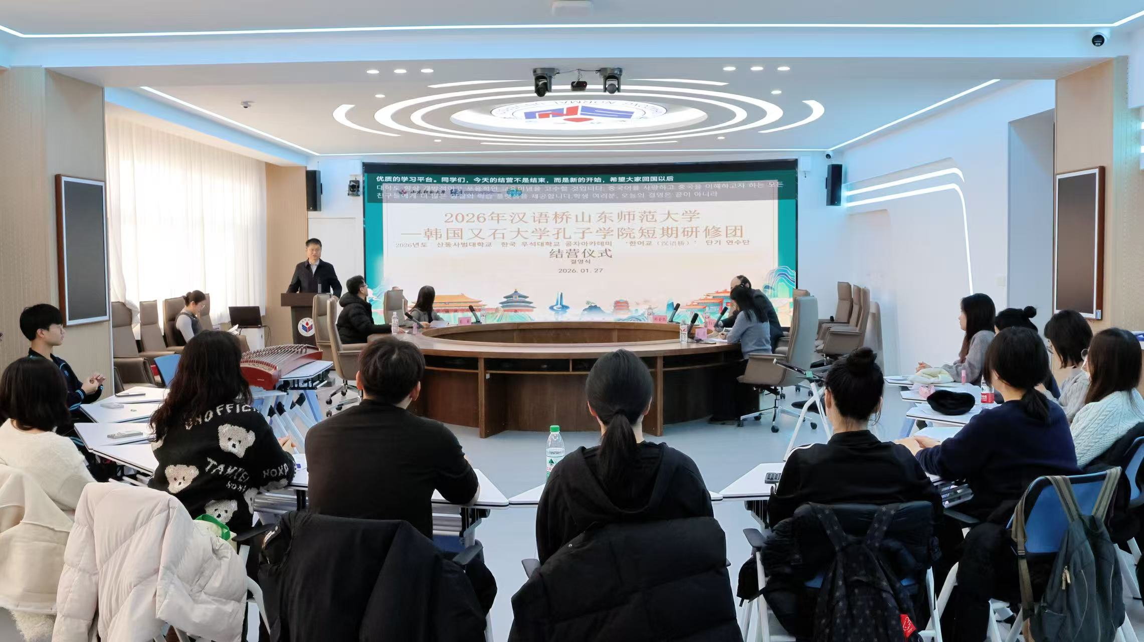 2026年1月27日下午,由教育部中外语言交流合作中心主办、山东师范大学国际教育学院承办的2026年“汉语桥”来华团组交流项目——韩国又石大学孔子学院冬令营顺利结营。山东师范大学国际教育学院党委书记刘金凯、留学生教育系系主任常庆丰、韩国又石大学孔子学院中方院长蔡莉、韩方带队教师崔镐硕、研修团任课教师代表刘园以及13名韩国学员、1名乌兹别克斯坦学员和全体志愿者参与了结营仪式。仪式由国际教育学院留学生招生科科员西茹静主持。