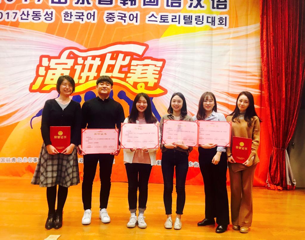 “2017第四届山东省韩国语/汉语大赛”于10月28日在山东大学知新楼三层报告厅顺利落下帷幕,来自山东师范大学国际教育学院的韩国留学生朴慧利同学勇夺大赛三等奖,韩国留学生郑英运、金星雅、权佳英三名同学获得优秀奖。