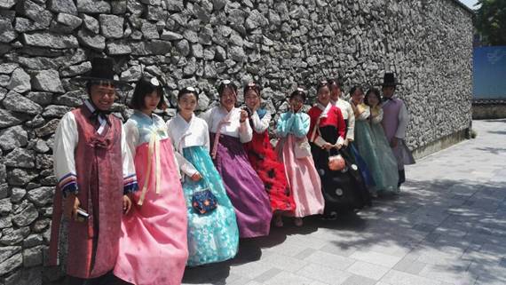 5月24日交流团在韩国学生的带领下抵达了首尔,也是在韩国最后游览的城市。到达首尔之后,我们的行程主要是租穿韩服和游览景福宫。通过这些,同学们很好的体验到了传统的韩国文化。韩服的构造以及穿戴方法和汉服是很不一样的,但是都具有传统的古代的东方女性的美,每个人都选择及穿戴了一套韩服。穿着韩服游览景福宫,也有一种不一样的感觉,仿佛可以触摸到韩国的历史文化。景福宫是古代朝鲜王朝王宫,得名于《诗经》中“君子万年,介尔景福”。正殿很大,其次正殿周围有很多很多的殿堂,还有游玩以及赏景的地方,类似于中国古代皇宫的御花园。景福宫的建筑群构造和中国古代帝王的皇宫还是有很多相似的地方的,说明两者有很深的历史文化渊源。通过这些,我们很好的感受到了韩国的传统文化以及现代文化。