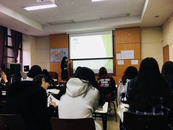5月21日上午同学们听了贺丽娜老师的初级实习课。新课开始前,老师进行了复习,对上节课的单词进行了听写。贺老师使用了大量的肢体语言,运用重复、夸张口型、多次停顿等方法让韩国学生们能够跟上学习进度。课上老师使用的是双语教学,汉语为主,英语作为辅助语言。同时老师会不定时的请学生们回答问题,提高他们的课堂参与度,并且在学生回答问题后,会对他们进行鼓励。让交流团的同学们体会到了书本上的理论知识是如何运用到实践中的,老师的各种教学技巧、课堂氛围的营造以及老师的个人魅力,都让同学们为之感叹和学习。