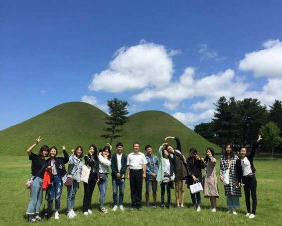 5月19日交流团一行人与韩国语伴来到庆州。庆州位于韩国曾是新罗王朝的首都 ,也是韩国古代文明的摇篮,现有人口28万,是一座恬静的城市。交流团和韩国学生一行人在大陵苑门口租借了自行车,自在的骑行在大陵苑之中,欣赏其中的风景。庆州是个很独特的城市,与釜山首尔这样的现代城市不同的是,庆州放眼望去都没有高楼大厦,房屋建筑大都只有一层,很少有两层的建筑。庆州保存了很多新罗时代的古代民居,他们大多数的墙都很矮,只要轻轻踮起脚尖就能看见室内的景色