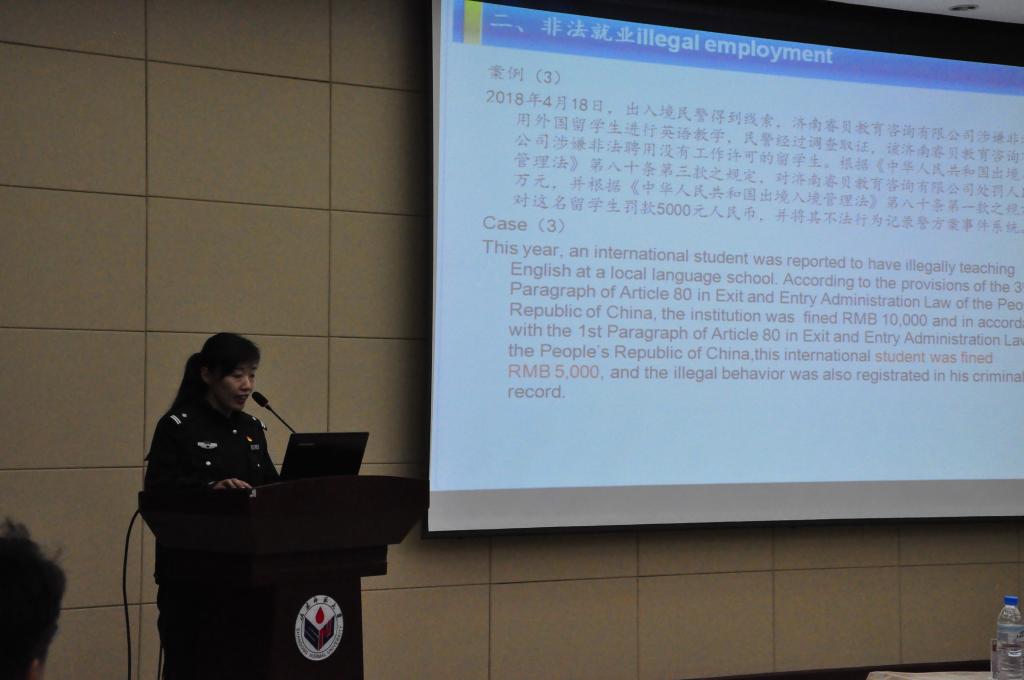随后,在郝秀丽的陪同下,王洪梅一行对巴基斯坦学生进行了外国人出境入境管理法教育。张黎霞为来自巴基斯坦的48名新生简要介绍了来华留学签证的负责机构、申请程序,结合留学生关心的签证类别、宗教、打工、机动车驾驶等问题重点解读了《中华人民共和国出境入境管理法》的核心规定,宣讲内容图文并茂,注重与真实案例密切结合,有效促进了留学生对相关法律条款的准确理解,集中解决了留学生的各种疑问。
