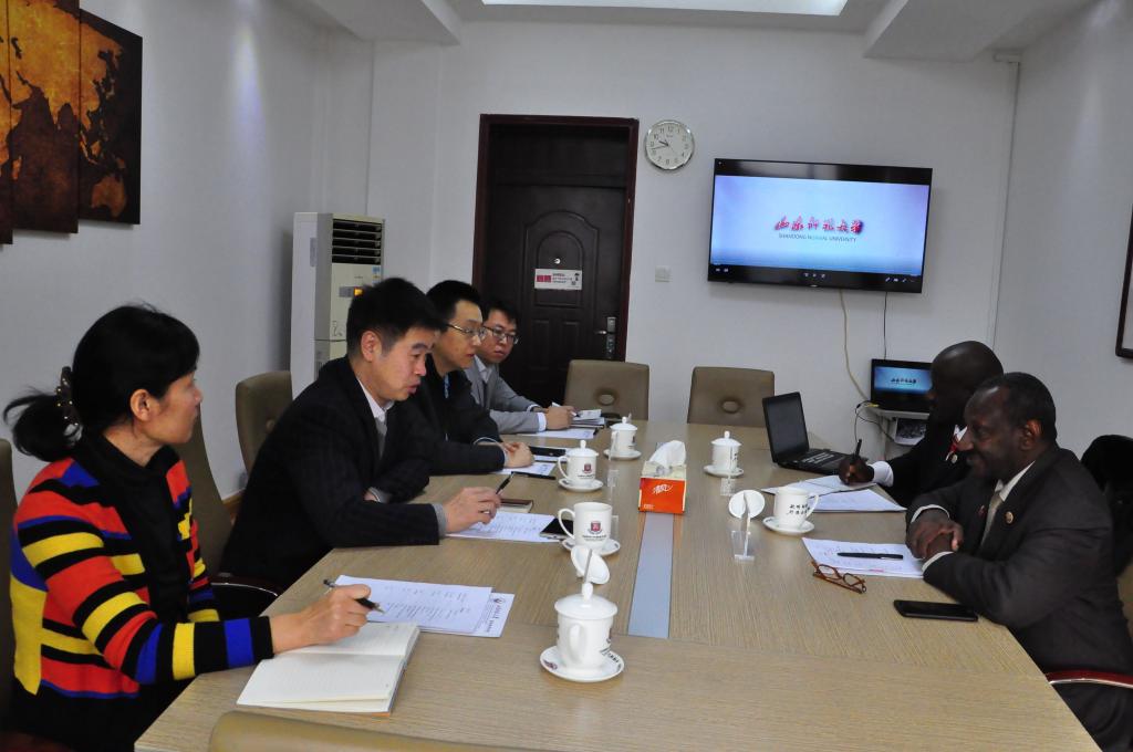 周连勇首先向Mohamed Elsanousi一行的到来表示热烈欢迎,在一起观看了山东师范大学英文版宣传片《梦想开启的地方》之后,他详细介绍了学校的办学历史、学科建设、师资队伍、留学生教育等情况。Mohamed Elsanousi对学院的热情接待表示感谢,并就杰济拉大学学科设置、办学特点等情况进行了介绍,表达了希望与我校开展实质性交流与合作的意向,特别是互派学生、教师交流、合作建设孔子学院等事宜。双方着重就上述领域的合作进行了深入协商,并达成初步共识。会谈结束后,周连勇陪同客人参观了学院智慧教室等留学生教学设施。