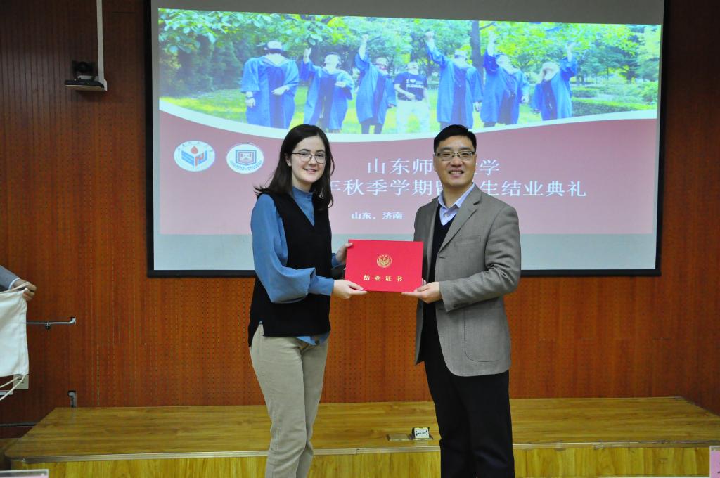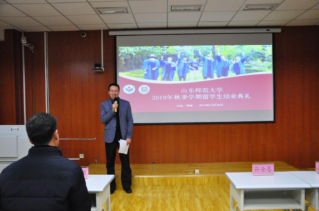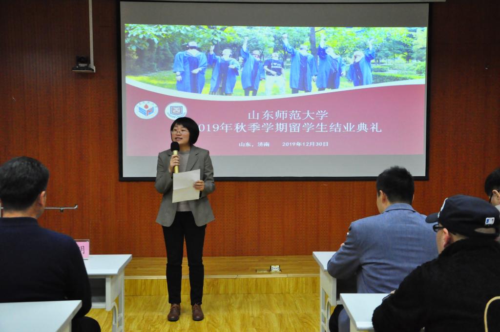 12月30日下午, 2019年秋季外国留学生结业典礼在千佛山校区教学三楼五层3517室举行,留学生工作办公室主任、国际教育学院党委副书记孙全志,学院副院长王其和,外事服务中心主任王秀明,学院留学生教育系主任常庆丰,学院汉语国际教育系主任郑翠,部分任课和管理老师出席典礼。典礼由留学生工作办公室刘峰主持。