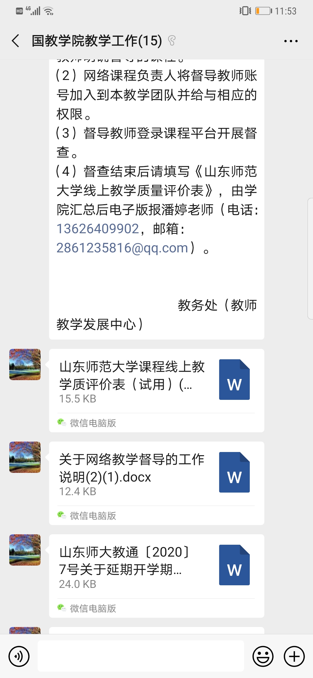 学院鼓励和发动学院教师积极开展线上教学,充分利用网上开放教学资源,采取灵活多样的教学方式,保证线上教学的教学质量和效果。学院汉语国际教育专业2019级本学期的四门专业必修课全部采用网络授课的方式为学生开展在线教学;2018级本学期有三门课程采用了网络直播授课,其他课程也正在利用微信群、QQ群等各种方式开展教学活动。