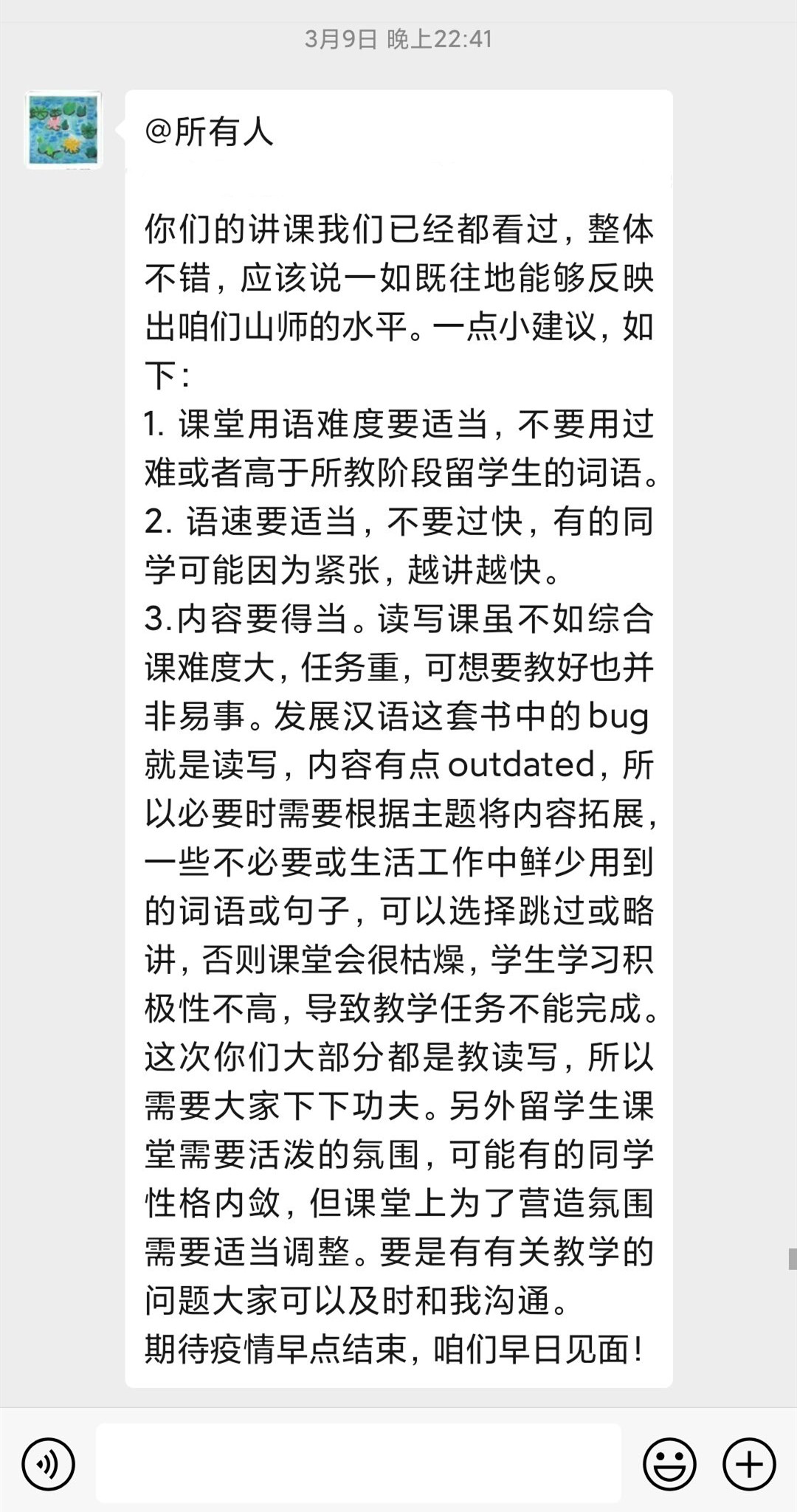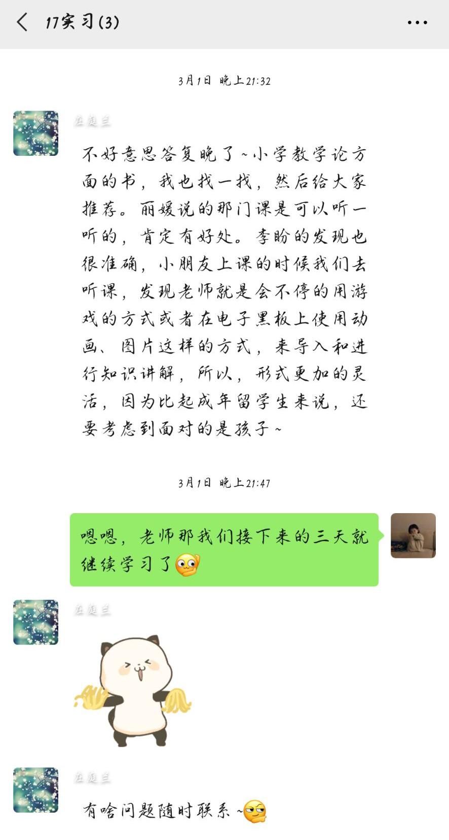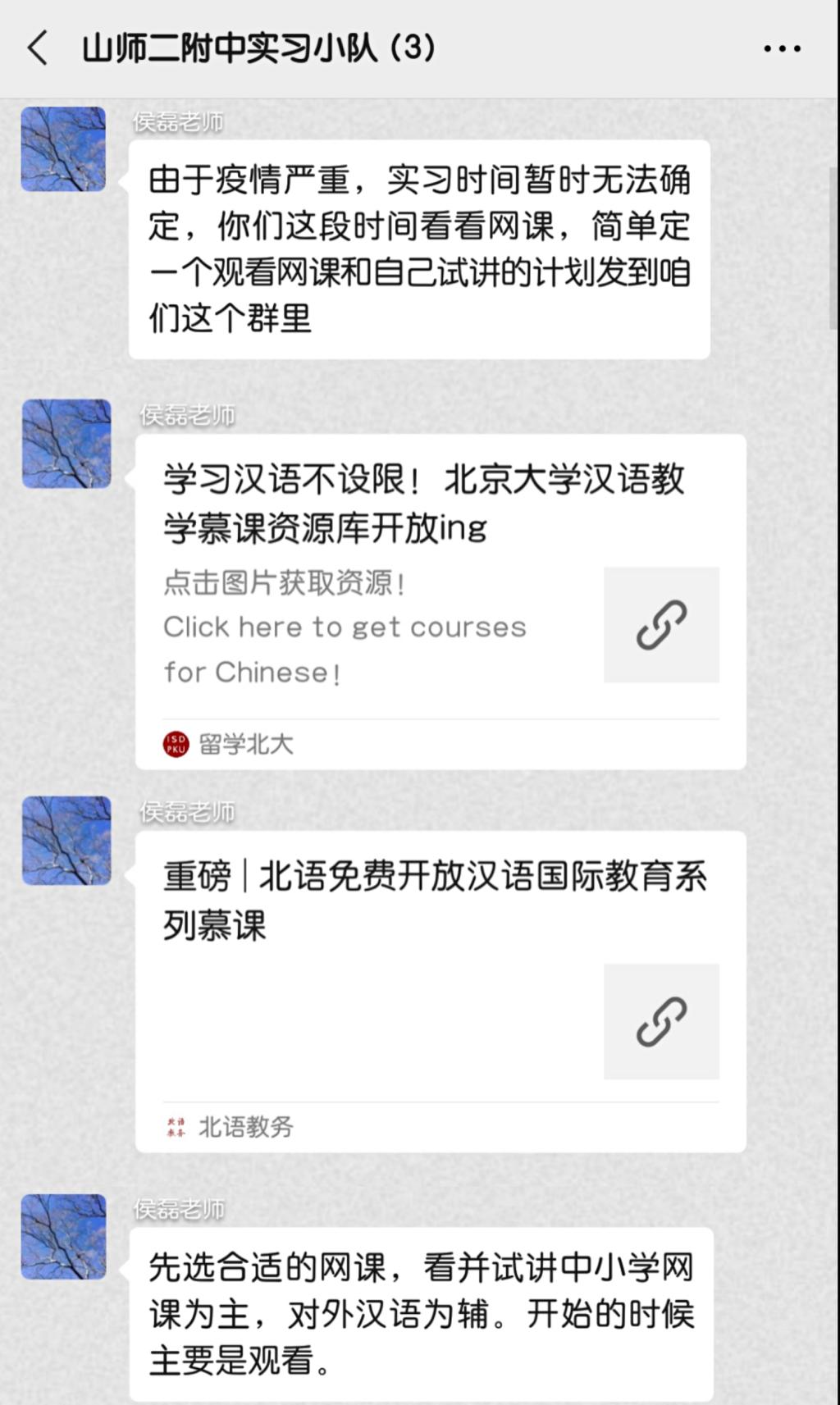 中小学实习小组的庄庭兰老师在假期及时与同学们沟通联系,帮助大家进行线上实习指导。庄老师为大家找到了济南各中小学线上教学视频,每次看完教学视频同学们都会写听课记录和心得体会,发到群里和老师沟通,庄老师会及时为同学们答疑解惑。虽然不能直接和学生接触,但是通过这种方式大家也学习到很多教学方法和技巧。庄老师很重视大家技能的培养,经常分享有关教师教学技能、班级管理技能以及中华传统文化等方面的资源,让同学们既要提高专业技能,还要打好教学的基础。除此之外,作为汉语国际教育专业的学生,在吸收中小学教学经验的同时也需要巩固和加强本专业知识,因此庄老师还安排了给留学生批改作业和指导发音的实习任务。在庄老师指导下,同学们都受益匪浅。