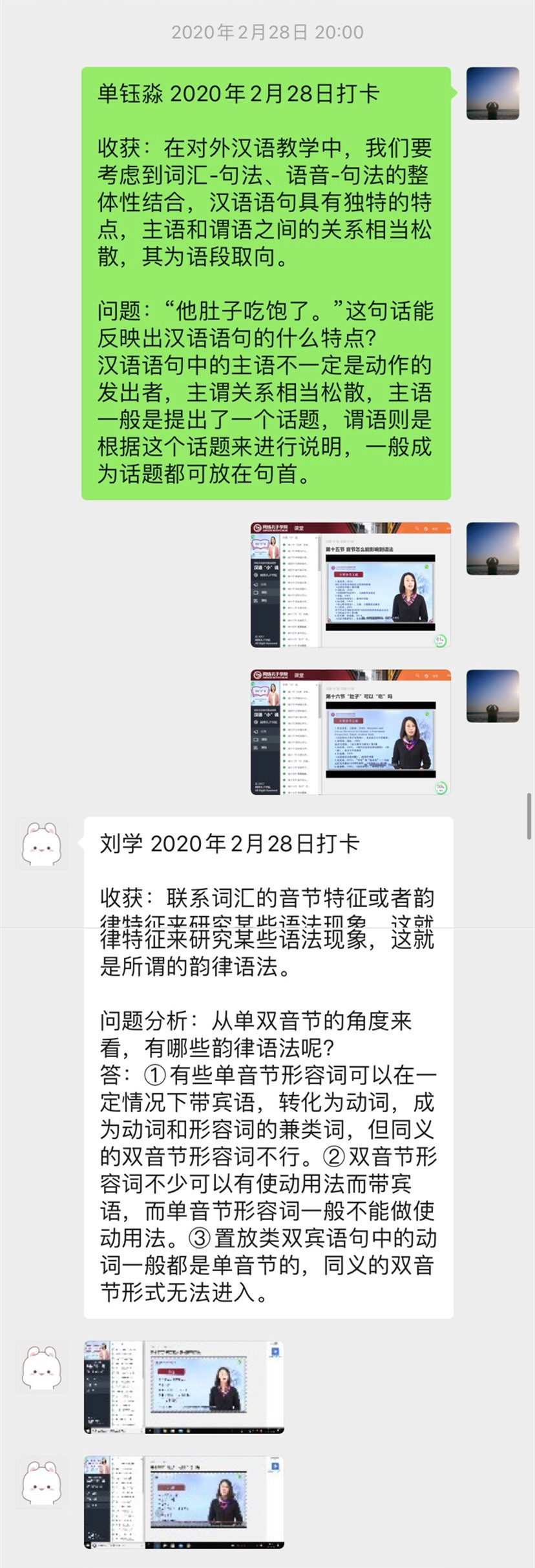 按照此前的实践教学计划。2017级汉语国际教育专业学生共分为13个实习小组进行,涉及61名同学。绝大部分教师实习指导工作参考了史洁老师的“一观、二评、三问、四研”的模式。以其指导的实习小组为例:该实习小组成员在老师的指导下,比较现有的网络课堂资源,最终选定网络孔子学院的教师培训基础课为该实习小组学习重点,通过“一观”(每天打卡观课)“二评”(对授课主体和内容做出评点,每周一到两次汇总)“三问”(对疑惑疑难疑义之处发问,每周一到两次汇总)“四研”(师生通过视频等形式分析解决疑惑,每周一到两次)的形式进行具体的指导与线上打卡学习。该实习小组同学们表示以这种方法为基础,在家中的实习工作仍十分充实,史老师一直认真细致地对实习小组成员进行指导,在每天打卡观课后不断给予激励与肯定,并对同学们提出的疑问进行耐心地解答。同时老师还注重分享有关教学与实习的创新想法,与同学们通过线上文字和视频语音通话等方式进行沟通交流,大家的想法得到了碰撞、融合。这样的学习方式师生之间也进行了积极的分享,目前日常打卡观课这种形式已成为各个实习小组的基本工作。