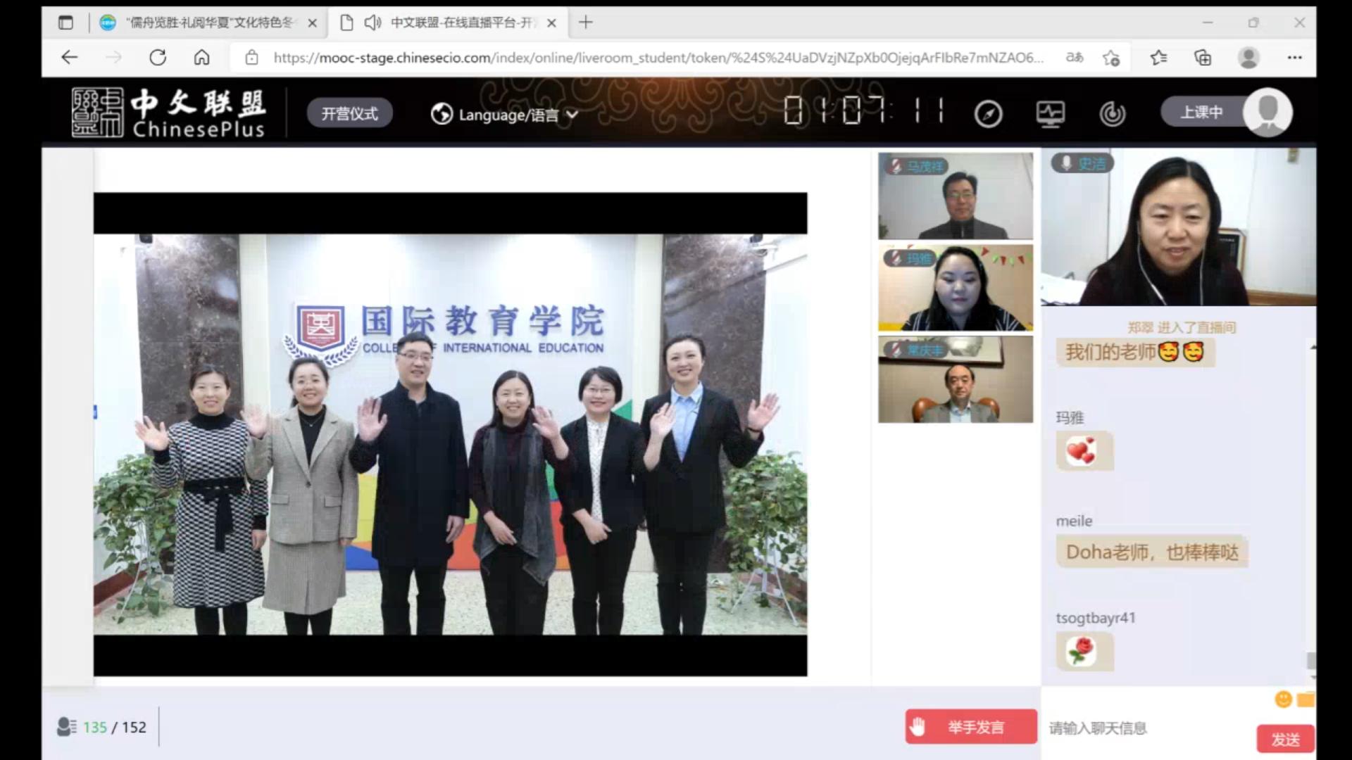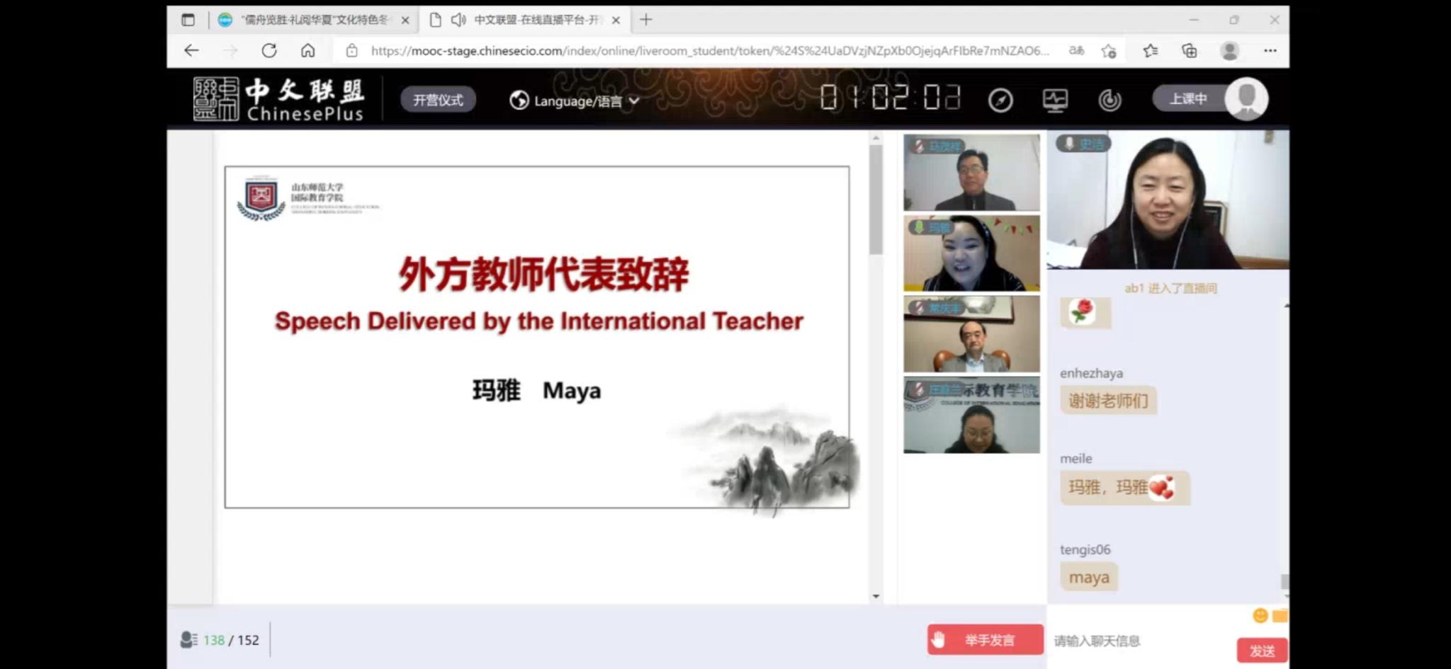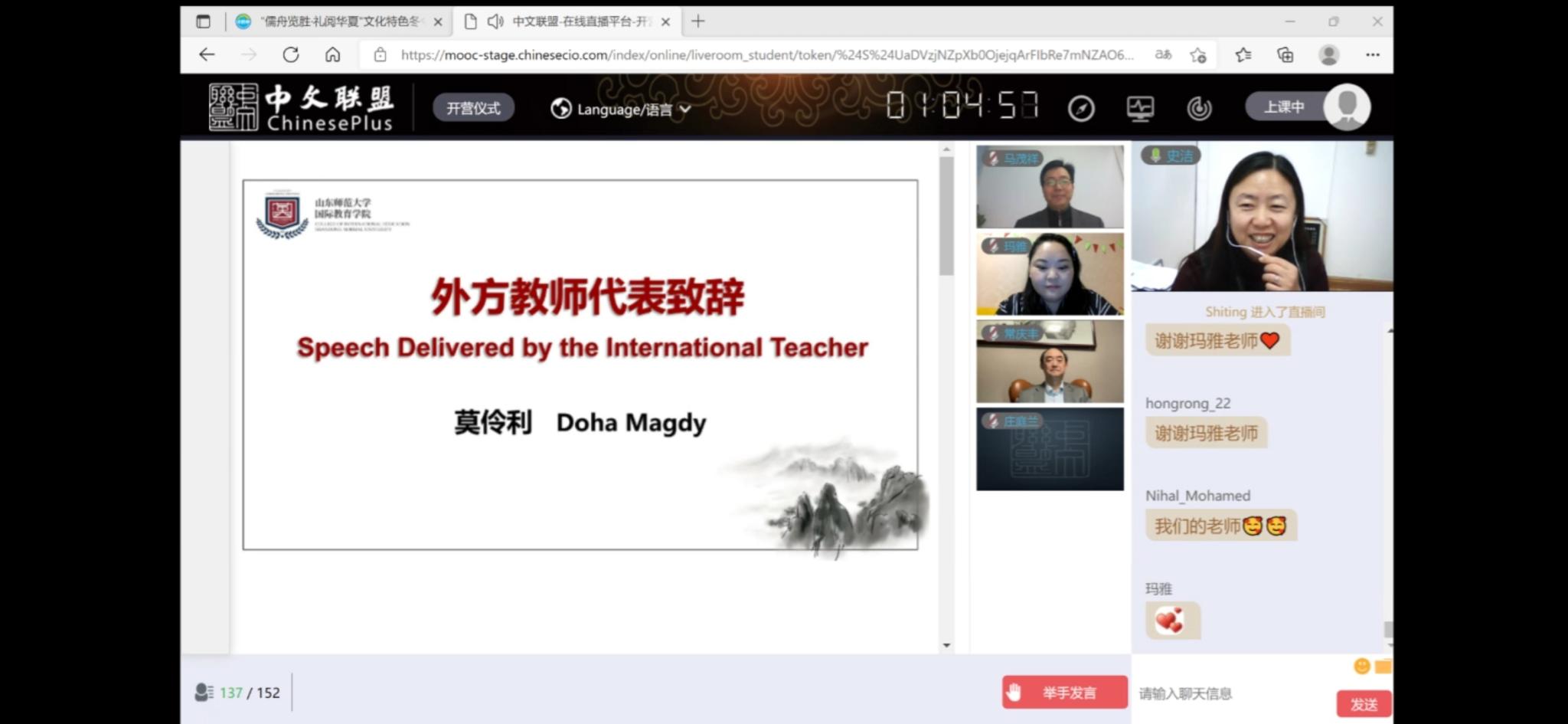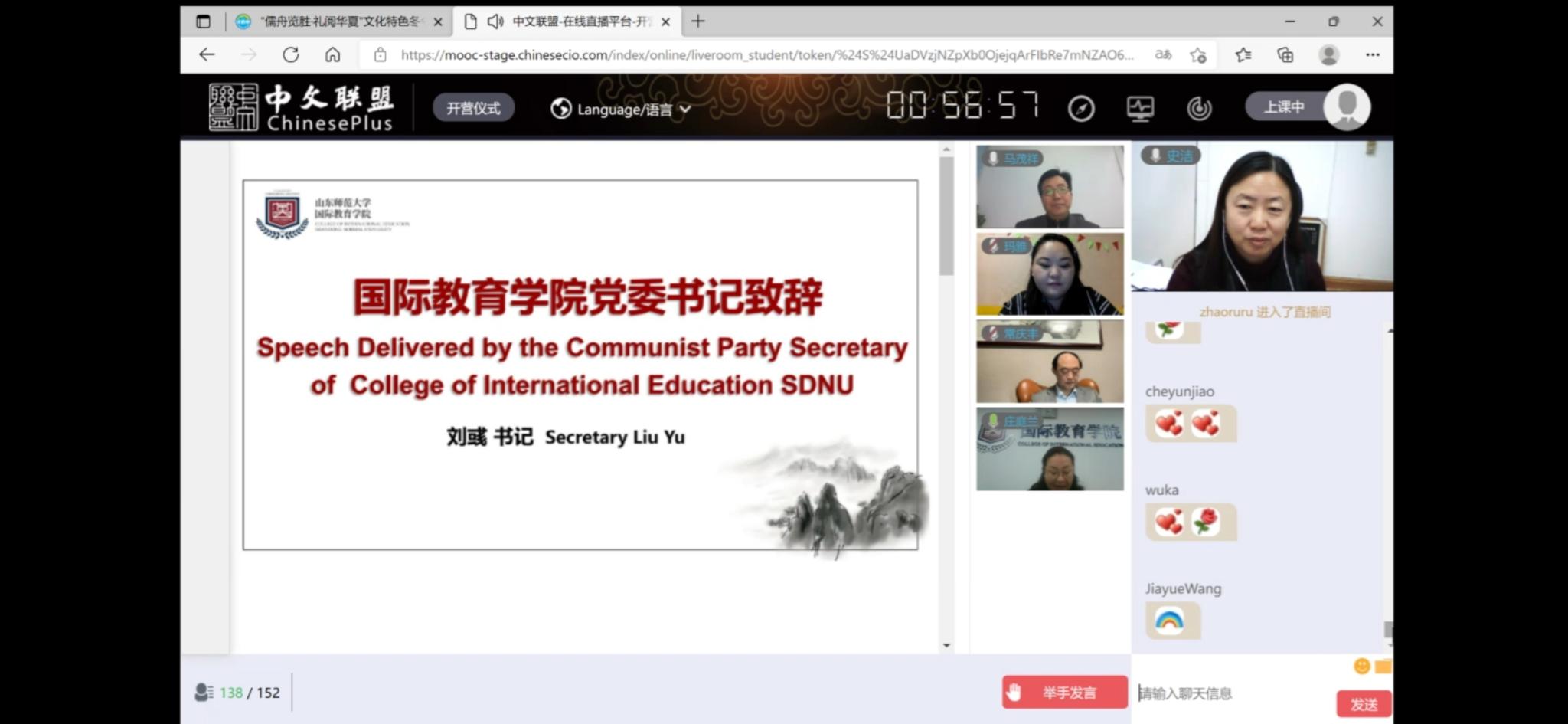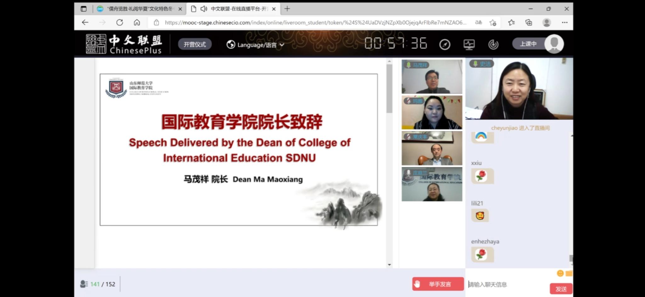 此次开营仪式由山东师范大学国际教育学院史洁教授主持,国际教育学院党委书记刘彧、院长马茂祥、留学生教育系主任常庆丰及中外教师代表共同参与。师生一起云端欣赏了山东师范大学的魅力风采和此次冬令营的精彩介绍。