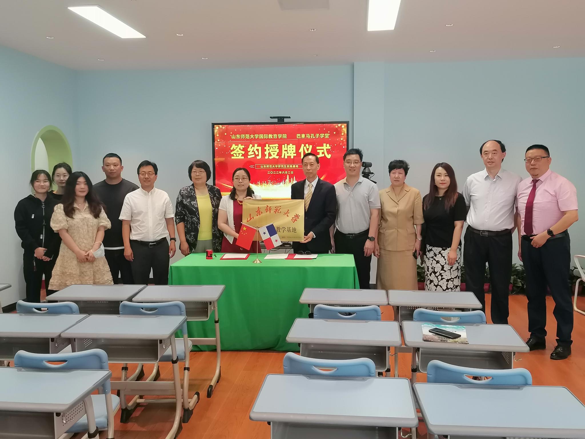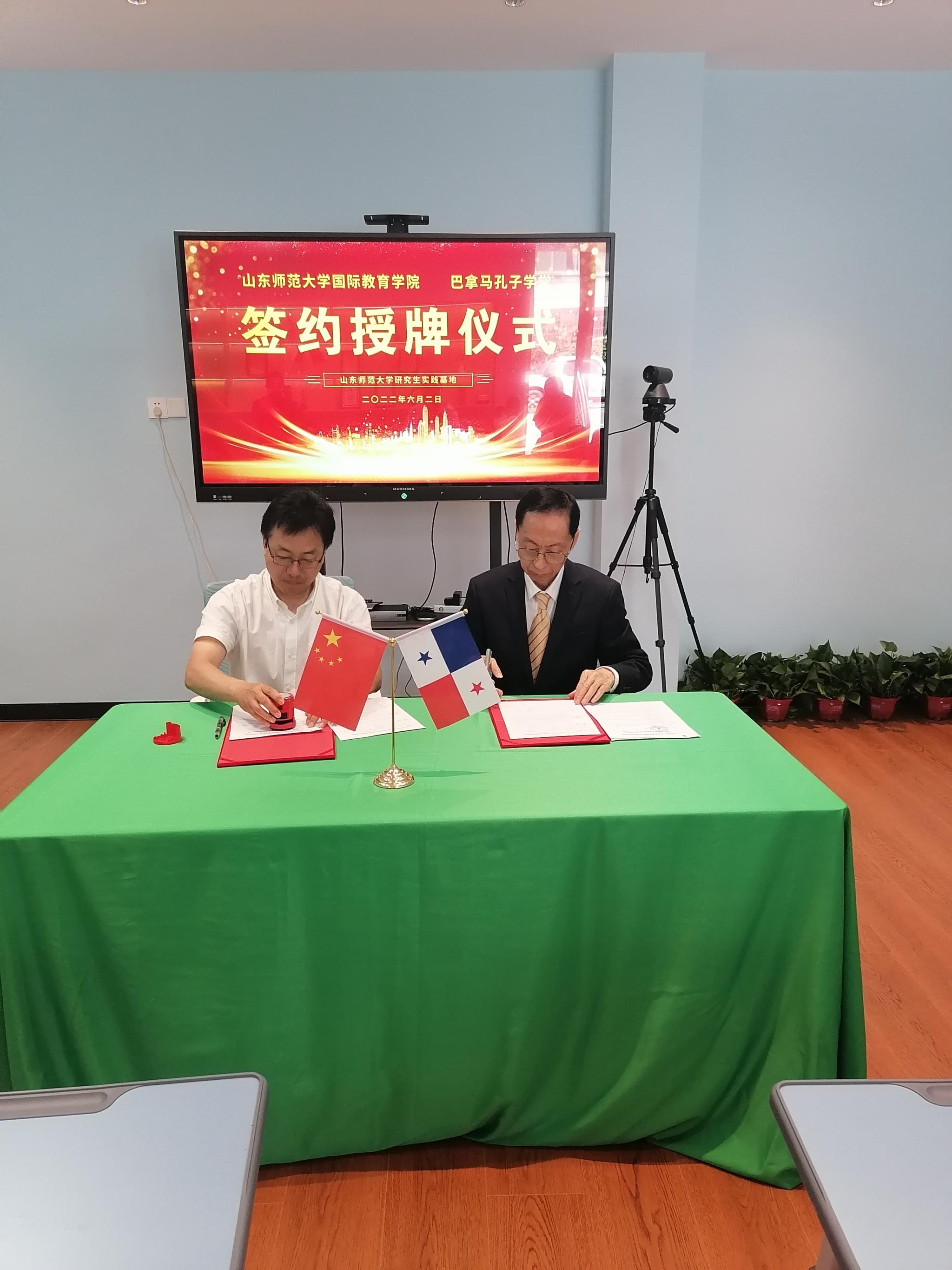 6月2日上午,山东师范大学研究生教学实践基地”签约及授牌仪式在海外孔子文化传播实践教学基地举行,山东师范大学研究生院副院长赵景欣、国际教育学院副院长马茂祥、副院长王其和及留学生教育系主任常庆丰参加仪式。尼山世界儒学中心(中国孔子基金会秘书处)国际交流部副部长李青、巴拿马孔子学堂校长刘科及部分孔子学堂负责人出席仪式。线上参会嘉宾有:巴拿马中国文化中心主任张雪云,肯尼亚中国山东商会常务会长张中端,爱中文总监沈凯,中国非物质文化遗产传承人“木偶姐姐”;线下参会嘉宾有:菲律宾孔子学堂项目负责人蔡笑甜,日本冲绳孔子学堂项目负责人杨叶青,巴拿马大学中国办公室主任张智玮等。签约及授牌仪式由刘科校长主持。