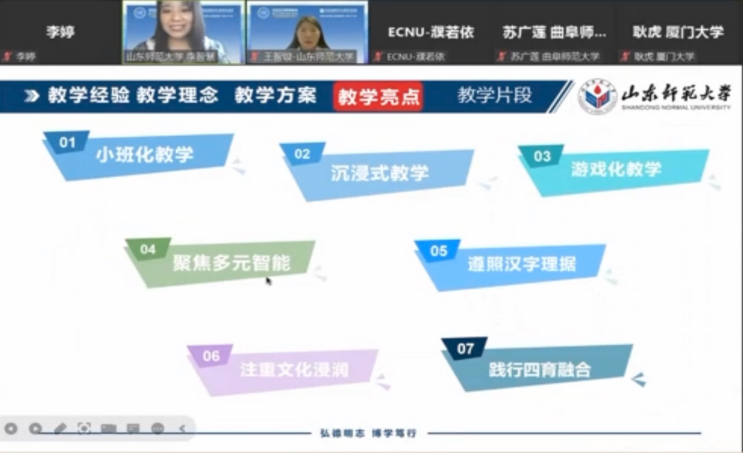 本次山东师范大学学生组代表队由国际教育学院郑翠老师担任指导教师,李智慧、王智璇、苏容舒、徐芸、潘李慧五位2021级汉硕学生组成。国际教育学院高度重视,学院领导全程参与指导,在教学设计理念创新、专家磨课指导安排、视频制作资源协调等方面给予了全方位大力支持。5名2021级汉硕生在郑翠老师的带领下,取名“趣学中文队”,展现了“趣学中文,乐学中文”的教育理念。该团队以四名5至7岁的巴拿马华裔为教学对象,以部编版语文一年级上册为教材,开展沉浸式中文教学,具有小班化教学、沉浸式教学、游戏化教学、聚焦多元智能、遵照汉字理据、注重文化浸润,打造四育课堂七大教学亮点。