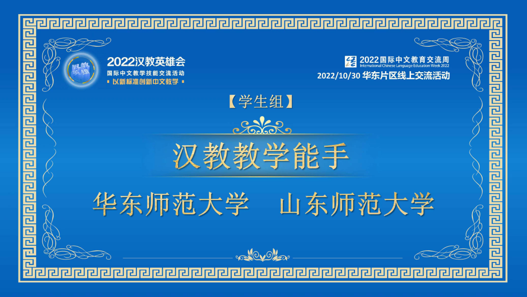 2022年10月30日,由中外语言交流合作中心、全国汉语国际教育专业学位研究生教育指导委员会联合主办,华东师范大学承办的2022“汉教英雄会”华东区国际中文教学技能交流活动圆满落幕。国际教育学院学生组团队在华东片区49所高校的62支队伍中脱颖而出,成功入围了此次交流活动,表现优异,被授予“汉教教学能手”的荣誉称号。