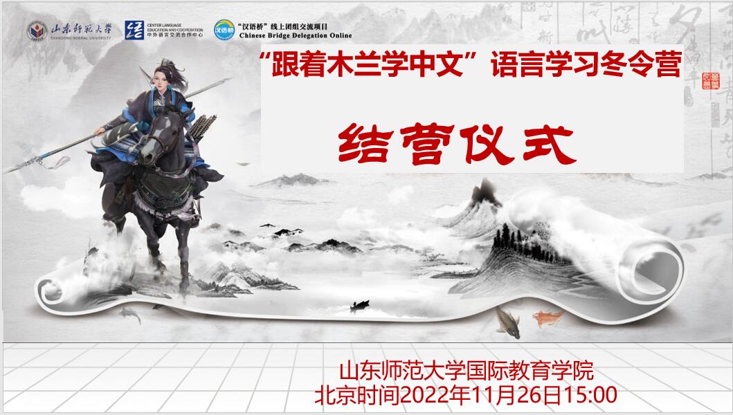 北京时间2022年11月26日15:00,由教育部中外语言交流合作中心(简称语合中心)主办,山东师范大学国际教育学院承办的2022年“汉语桥”在线团组项目——“跟着木兰学中文”语言学习冬令营圆满结营。