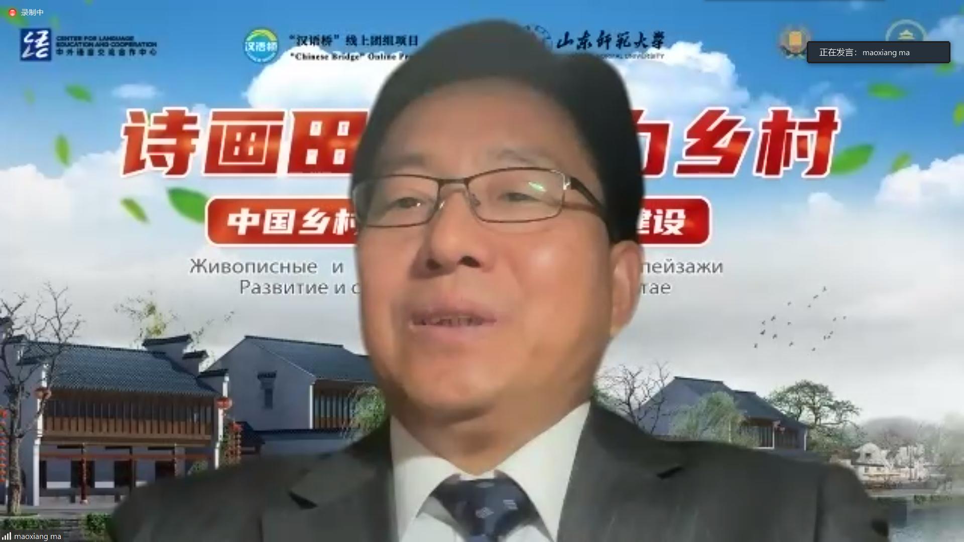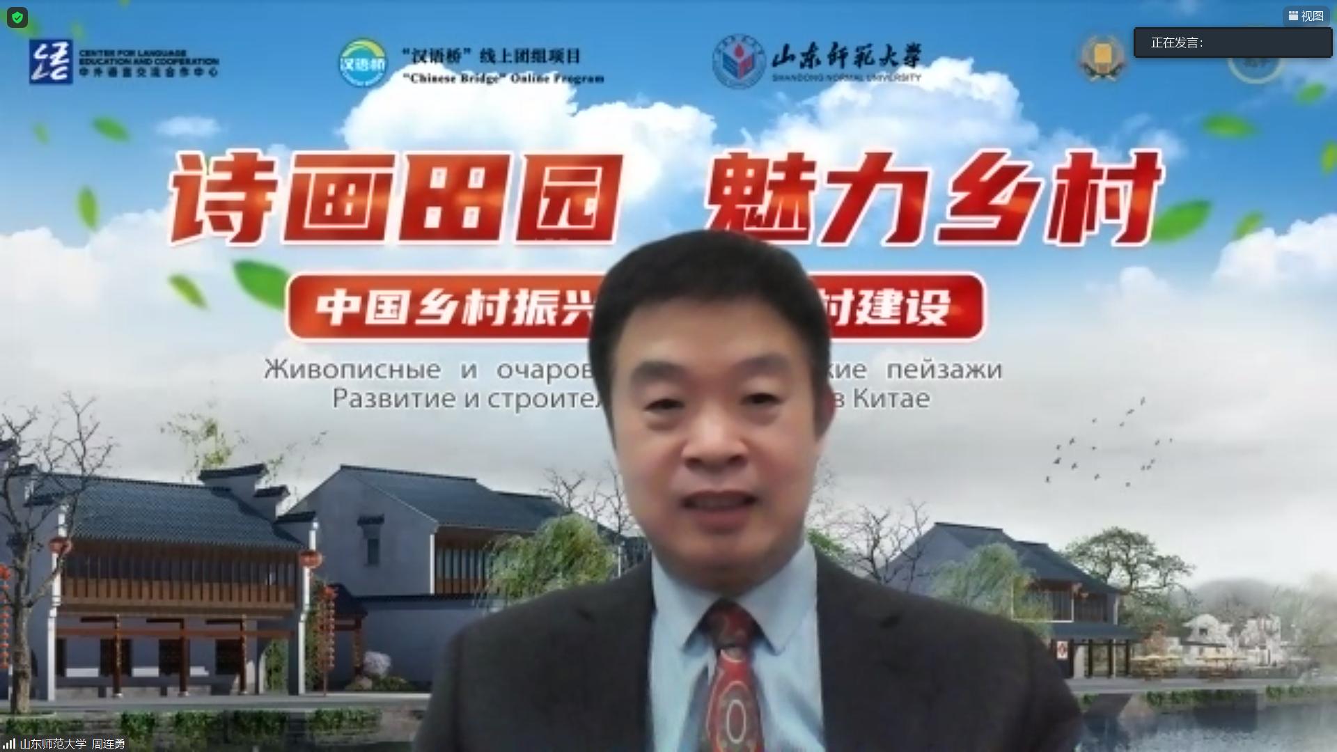 山东师范大学国际交流与合作处处长、孔子学院办公室主任周连勇在致辞中首先对本次线上秋令营活动的圆满结束表示祝贺。他表示,师生们相聚云端,以线上直播课、录播课和讨论等多种形式共同打开了新时代中国乡村建设的画卷,相信同学们对中国乡村有了更为深入的了解和认识。同时也欢迎各位同学有机会来中国亲身体验课程中所展示的中国乡村的变化,并期望在今后的交流中,山东师范大学能与斯塔夫罗波尔国立农业大学、圣彼得堡孔子课堂加强协作交流,进一步推动中俄友好事业的发展。
